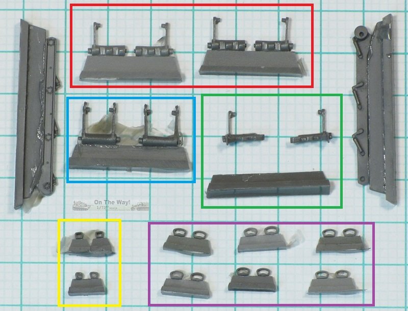 The remaining pair of mounts (parts R29 - left and R30 - right, green box in below photo) are for the first paired roadwheel. Note that the mounts for the first