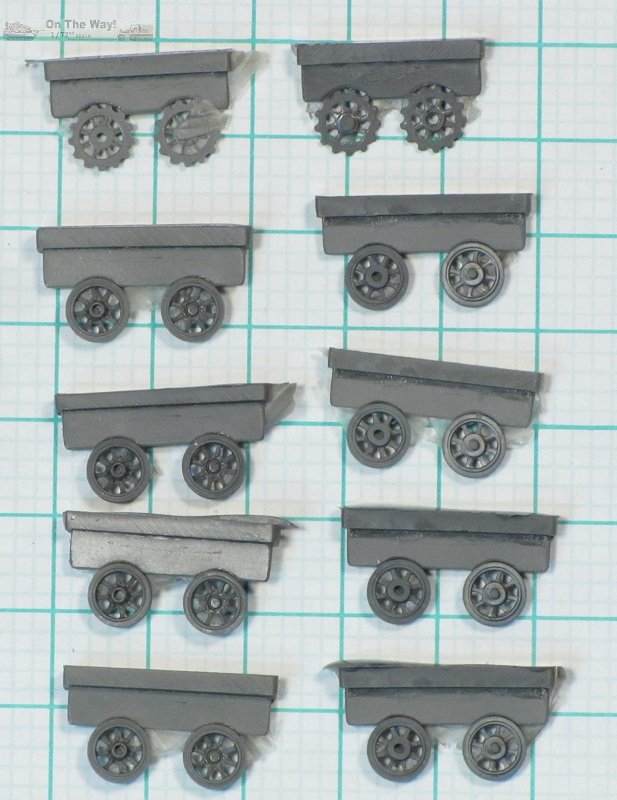The eight paired roadwheels and two sprockets are crisply cast. The sprockets have 8 spokes and 13 teeth - they should have 15 teeth, though the difference is
