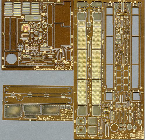 When I first started posting scans of etched brass sets, I would count and describe all the parts for each set. That had become more difficult in recent years, considering the vast number of parts included with the PART brass sets. One can see from the scan above that this set replaces and adds a great amount of detail to the Hasegawa Ostwind kit. I'll just point out that in addition to this set, there is another Ostwind set which includes a new turret, and also a couple sets of zimmerit coating. Note that the largest and smallest frets of parts shown above are included with all of PART's Panzer IV sets for the Hasegawa kits. Only the mid-sized set in the upper left is unique to the Ostwind.