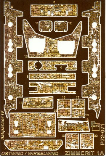 A fairly self-explanatory set. One error however: there are cutouts in the chassis pieces for the fuel filler caps on both sides of the hull (right behind the second and third return rollers). These fuel caps are only on one side of the model (and the real vehicle). It looks as though these brass pieces could also be used on the ESCI Wirblewind, which incorrectly has these caps on both hull sides.