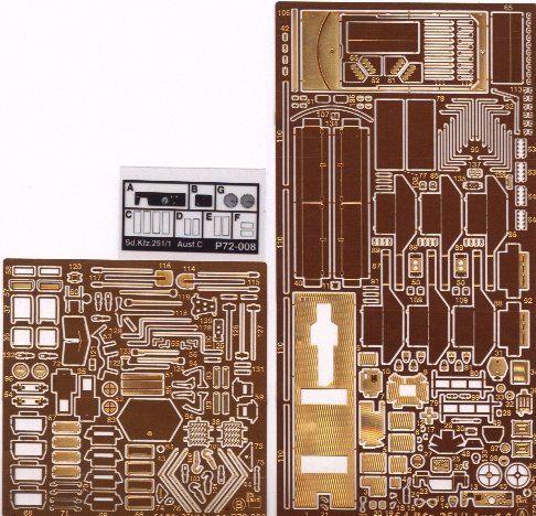 This is without doubt one of the areas that has grown up in the last years, as each new kit released in Braille Scale has been accompanied by "extra equipment" mainly from Photoetched producers, like it's usual by now, in the "bigger scales". Part has been giving us some excellent sets for detailing & correcting old and new kits. In this case, I present here the set for the old ESCI Sd.Kfz. 251. This is a generic set, meaning that almost any version of the ubiquitous Ausf. C could be used - if you manage to lay your hands on one. The quality is the normal high standard already presented in other sets from this producer, but not to my liking, there are too many small parts that are useless to me, like the tools (in 3 parts!) and some of the interior, needing not only good eye sight, but also steady hands Overall a very good set for this "long in the tooth kit", even if some of the parts could be very easily replaced by scratch parts in plastic, but this is a personal opinion.