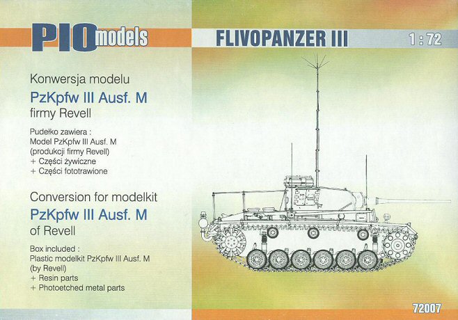 This is a multimedia conversion that comes in a box with sliding top. Firstly, it includes an almost complete Revell Panzer III M, with its decals and instructions. I said almost since, curiously, the turret bin, three schurtzen supports and the smoke grenade launchers pieces were removed from the sprues and are not present in the kit. I find this curious because, even when those pieces won’t be needed for this specific model, the rest of the schurtzen arrangement is there together with many other unneeded parts. On the other side, one extra copy of the antenna base -piece #31- is included.