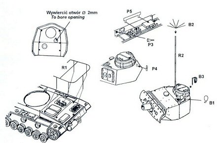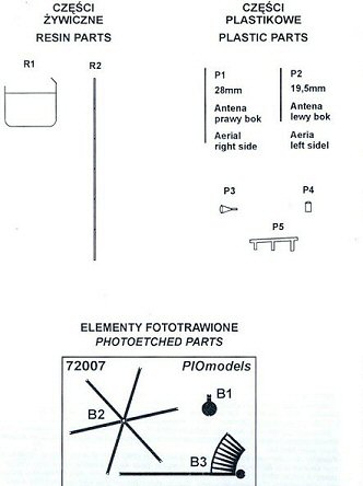 The resin pieces comprises an antenna holder and telescopic and frame antennas. Both antennas are not that nice representations: the frame antenna seems quite tick and the telescopic antenna -which got curved- has, wrongly, each section of the same diameter, whenever in the real thing each higher section should be thinner in order to fit inside the lower one when collapsed.