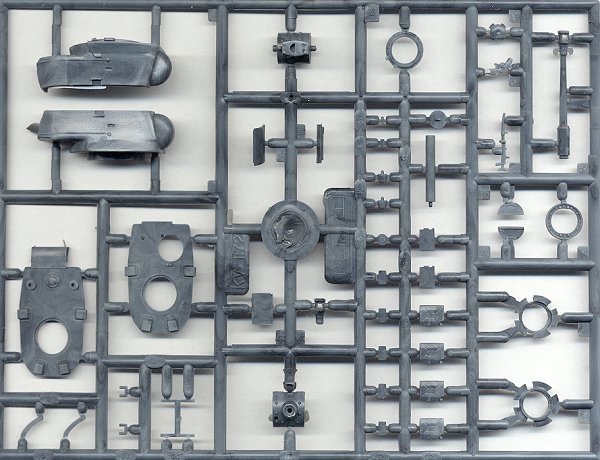 Much of this kit is the same as the earlier KV-1 kits. It includes the same track and miscellaneous details sprues, and the wheels sprue which includes the lower hull is mostly the same. Specifically, the lower hull and chassis are the same, but the road wheels and return rollers have changed to the later variety, pictured below.