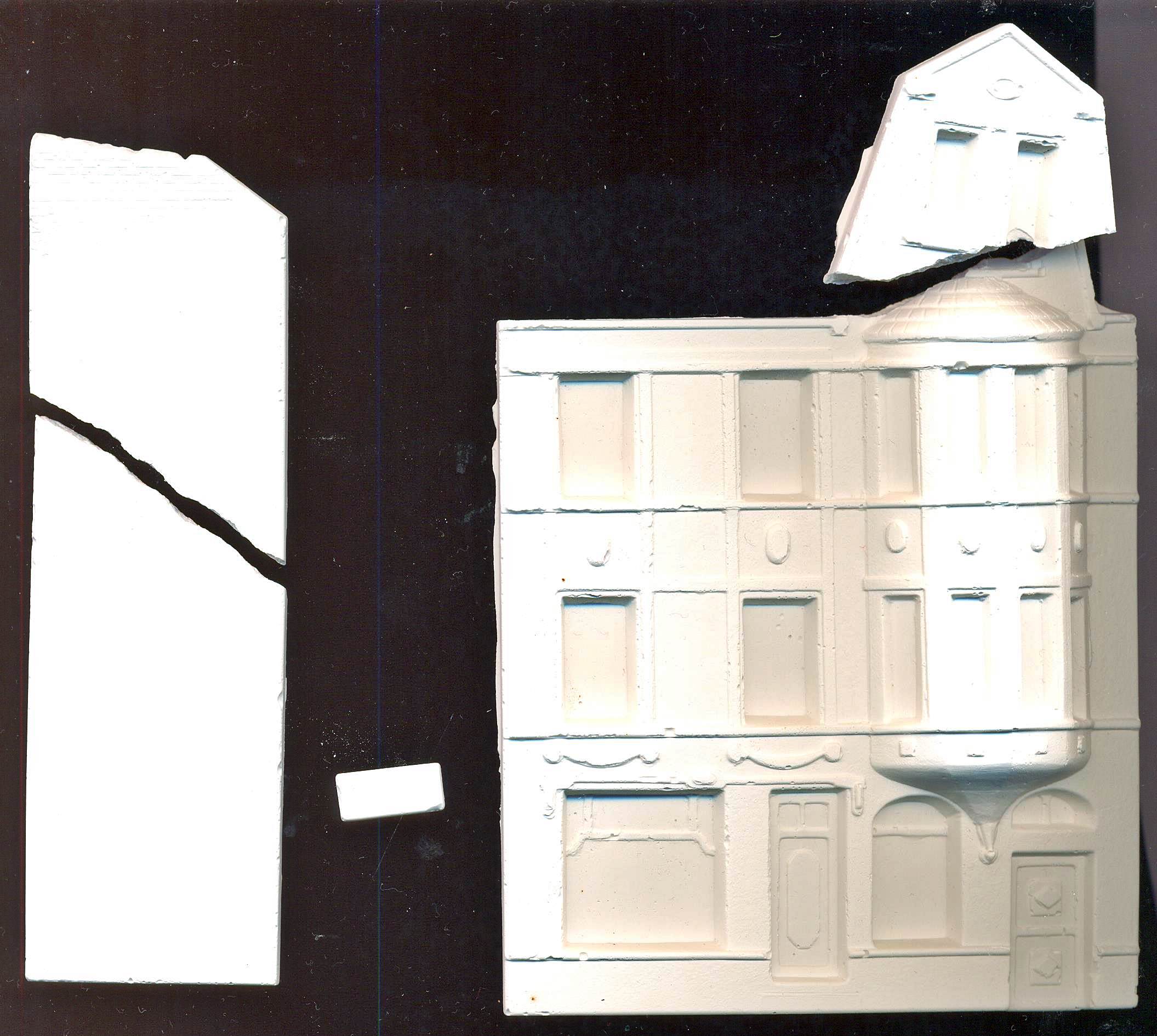 This is a simple set consisting of 3 plaster parts. Mine actually consisted of 5 parts as both big ones were broken, even though the set came in bubble wrap and a sturdy cardboard box.