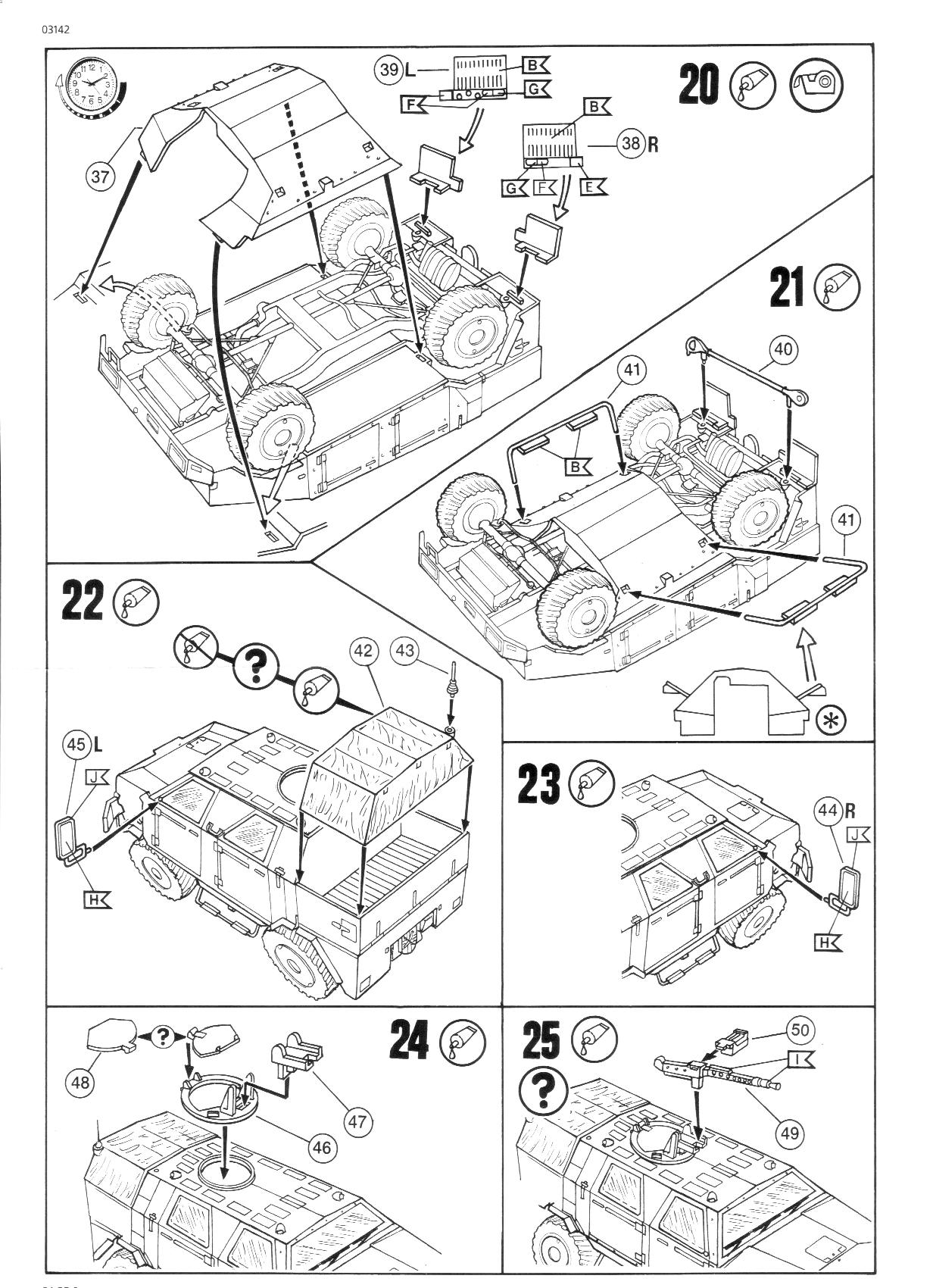 As per my usual, the kit was built pretty much straight out of the box, not modifying the kit much other than to drill out the openings in the front bumper, the exhaust outlet in the muffler and add an antenna cut from guitar wire. This kit builds up nicely. Fit is excellent though it is a bit tight in places. Pay particular attention to the mine blast shield under the body. I found this to interfere with the chassis frame which made the frame twist and skew a bit resulting in a major body slant. I rectified this with some sanding and scraping to relieve the contact point causing the problem. I was not impressed with the molding of the side windows. They all come with small tabs, which I suppose are there to help position the window into its opening, but in my mind they detract from the overall look of the windows. They also had a habit of breaking off when the window was pushed into its opening leaving a small white mar in the clear plastic. I suppose these tabs could be removed beforehand and the mars touched up with some sanding and polishing, but that seemed like more work than I willing to do. I suppose one way to reduce their presence would be to dirty up the windows a bit to try and hide them. As far as I can tell, the kit is accurate save