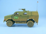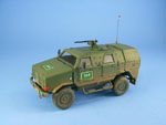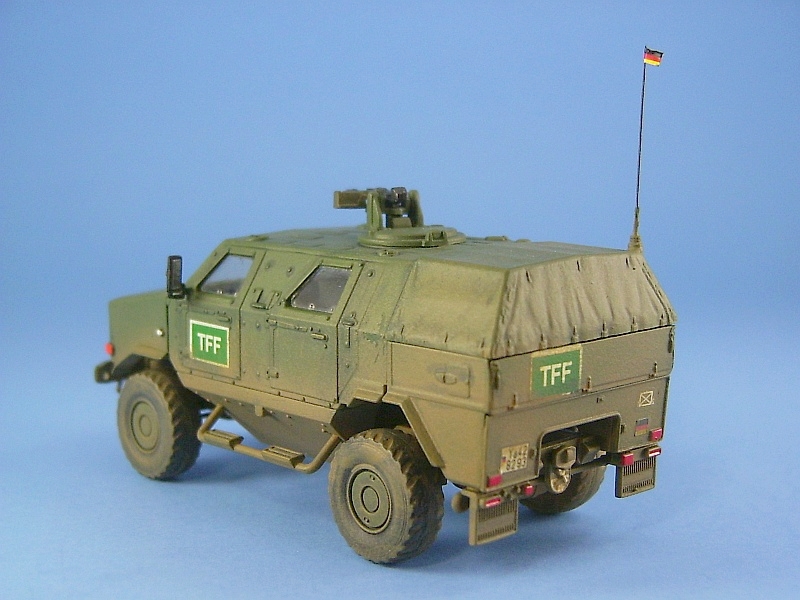 are given: I chose the Task Force Fox option for markings. The decals are not quite correct as presented on the decal sheet. The green TFF rectangles lack the narrow white border which I added by placing a slightly larger rectangle of white decal underneath the kit decal. Pictures of sister TFF Dingoes found at reference [1] show that there should also be German flag markings for the front bumper and on the right rear body panel. I made these from scratch, cobbling together other decal pieces to make the flags. This was quite easy to do since the flag consists of just three horizontal bars of black, red and yellow moving from top to bottom. I also made one additional flag which was attached to a piece of guitar wire used for an antenna and then attached it to the antenna mount at the rear of the vehicle. On the whole, this kit is quite easy to build. For me it took quite a bit longer to finish than my other armour builds, not because it was difficult, but because I wasn't thinking too clearly when I first bought the kit. Arriving at the point where I had to mask the windows I came to realize why I had returned to armour modelling. I was suffering from a form of “masking phobia” brought about by my latest aircraft projects. A return to armour modelling looked like it might be the cure, where masking for the most part is limited. Unfortunately I wasn’t quite cured of my phobia so this kit sat for a few weeks until I finally forced myself to get on with the masking and finish painting and building the kit. References Review sample purchased by the author. |