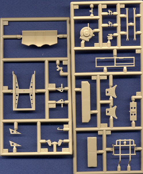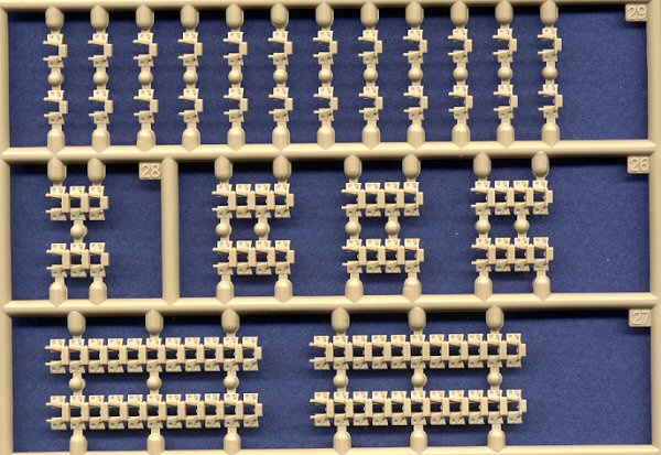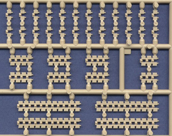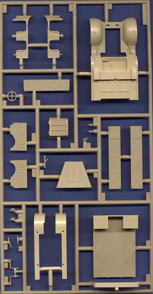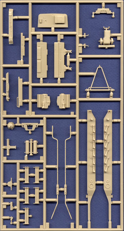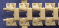 My wife was wondering all through the last months about my eagerness to accompany her on her way to the supermarket and even into the fashion shop. Dont you all worry I was not ill, I had just fallen into a hunting fever. I admit Im a real Famo maniac and since the first announcement that Revell would release a bull in 1/72 I got nervous. My secret hunting place was a simple toy shop at my local shopping mall here in Germany. Now you may guess where that sudden rather perverted interest for shopping came from. Each time we stayed there, I rushed into the toy shop and looked into that little Revell corner and came out with disappointment on my face. All that, again and again since two days ago. Finally there she was: the Revell Famo. Only one box ... I grabbed it and, looking anxiously over my shoulder like Richard Kimble on the run, I dragged my trophy home. And yes that dogged creeping up on the prey paid off. The Revell Famo is a super model. Revell even had a bonus surprise for me. Opening the box a little note fell out saying: "with this kit a sprue is included which is not mentioned in the instructions and is not needed to complete the model". This sprue contains a complete earth spade used as a sonderausführung for Famos involved in heavy winching. You may see a 1/35th scale Famo with this special equipment made by Bob Oehler at the Missing Lynx gallery. Hopefully this part will stay with the kit as it allows some quite interesting variations. The kit comes in five sprues (and the "extra" sprue) plus a strip of clear film and a decal sheet. Everything is very clean and clear. No flash anywhere and the parts are highly detailed. (There are two scans pictured of the tracks: front and back; only one sprue is included with the kit.) Separating the parts has to be done carefully not to injure the precisely engraved details. A fresh hobby knife blade is surely advisable. As I see it no sanding or putty use will be required at all. Moulding quality is excellent. Some parts are so thin you may even look through them. A fact that may prove that modern injection moulding can compete with the finest resin kits that are out on the market today. Some highlights of the Revell Famo from my point of view are: