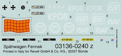 ![]() This new reconnaissance vehicle has barely entered service, and we are already provided with an outstanding model kit of it. I think this may be the first Fennek kit in any scale. The Fennek is the result of a joint project between The Netherlands and Germany, and is now in service with both countries in slightly different forms. This kit allows the construction of both national versions. Because it is such a new vehicle, references for it are few and far between, but I have been able to find several photos in some books and on the web. This kit appears to be highly accurate, as to be expected from Revell's latest releases. All of the rooftop hatches are open, which is a great improvement over past kits, though the two main entrance doors on the vehicle's sides are molded closed. Not surprisingly, there is no interior detail. There are several optional parts, depending on which version you wish to build, including a couple of armament options. The optical sensor is positionable, and you have three position choices: fully retracted (hatch closed), fully extended, or partially extended. There is a sheet of very thin clear acetate to be cut into shape for use in the windows. Although this involves a little extra work for the modeler, I think that the thinness of the plastic is a huge improvement over the normally injected molded clear styrene. There is plenty of extra, so that it may be used on other kits as well, such as the Fuchs. The detail on everything is first-rate, except I feel that the machineguns could use a little more detail. Also, this is the first Revell kit I think I've ever seen that has some sinkmarks in the plastic. There are a couple of places on the roof top that have some slight depressions in the plastic, and it's also very obvious on the ammunition bins for the grenade launcher. Luckily they are all in flat open places where they will be easy to fill. Markings are included for one German KFOR/ISAF vehicle, and one Dutch vehicle. Overall they are well printed, though the Dutch flags are slightly out of register.