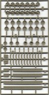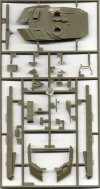 This first sprue includes the main hull parts. Again, this is the same hull as in the A4 kit. Detail is very fine, everything is well-molded. My typical complaints are the closed driver's hatch, and the pioneer tools molded onto the hull. The configuration of the driver's hatch is incorrect for the A5. When upgrading the A4's to the A5 version, the driver's hatch was redesigned to slide open to the side, instead of lifting and twisting open. The kit includes some additional armor parts to be glued in front of the hatch, which will help in reshaping the hatch a little bit, but more work is necessary to make it correct. (Note that one side skirt is missing in the scan; of course, two come with the kit.)
