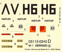 Markings are included for two vehicles: one Desert Storm, and the other in Germany, 1995. Decals are thin, matte, and mostly printed in register (the red and orange are a little off). Highly recommended.