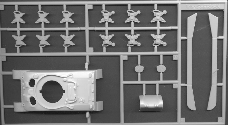 Although the model is actually very well molded with adequate detail, and no flash or sinkmarks, it is a highly inaccurate kit. The dimensions are totally screwed up (according to Hunnicutt's Sherman - A History of the American Medium Tank). The hull scales out close to 1/76th, while some of the parts are much larger. The wheels for example actually scale out to 1/70th.