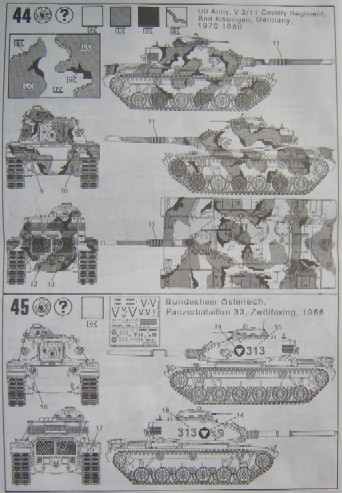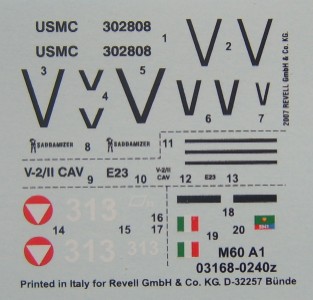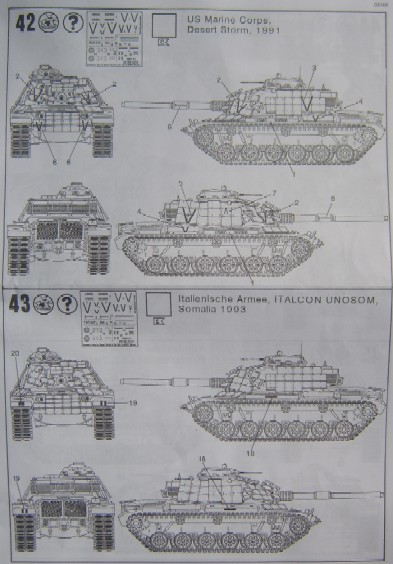 | Well we didn't have to wait too long for the next M60 release, this time it is the A1 version with the ERA armour array, this is the same as the base M60A3 kit with all the same mistakes, which are thankfully not that many and is concerned mainly with the tracks or rather the guide horns, they are in the wrong place ! depicted on the kit as being in the centre of the track instead of being part of the centre track connector as they should be. Still nothing that can not be fixed with a little work. The main sprues are the same as the M60A3 kit already reviewed. The extra sprue contains the parts for the A1 version and the ERA array, these include a new gun barrel without the thermal jacket of the A3, again this comes in 2 halves, which creates a seam that needs to be removed afterwards, the sprue also includes a new sight housing for the turret roof as well as a new housing for the stereoscopic sight mounted each side of the turret. The ERA array comes in blocks, but lacks any par of the mounting frame used, this is not so bad as for the most they are hidden anyway, but some of the turret ERA it would be visable from certain angles and the purists amongst you might want to add this detail. Markings are provided for 4 vehicles 2 US, 1 Italian and 1 Austrian References: