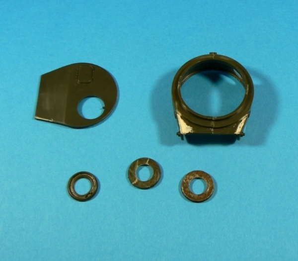 The commanders cupola also needs some attention. It sits too low and the hatch opens the wrong way. I cut the top off, moved it 36 degrees and glued back in place. A washer was added underneath - all three parts can be seen on upper picture and the result is on lower picture. A hatch stop and a catch holding it in open position was made from scrap PE.