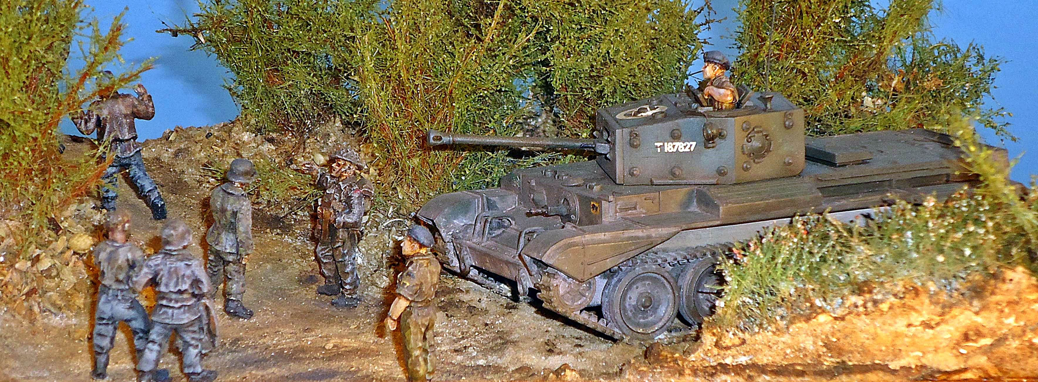 in the summer of 1944. The markings of the 7AD observation vehicle seem to be correct, though. There is however a slight misalignment in the red-over-blue square on the sheet I had at hand. The model was painted with ad hoc mixes of Vallejo paints. A black base coat was painted first over which shading with green was applied. I only hope the resulting shade comes close enough to British Olive Drab (SCC15). The diorama below was created with AB Figures (set BLA28 for the Tommy with prisoners, but for the love of any deity, I can't remember which set the tank crew came from, even though I believe they were AB too.) References [1] Le Tommy de la libération, Tome 2, J. Bouchery, Histoire & Collection (also available in English) |