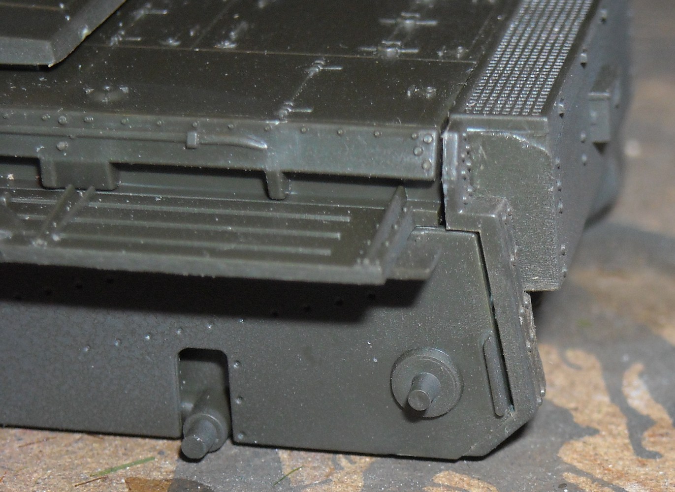 All parts have very nice detail, even the underside of the hull, and most of them are fool-proof due to intelligent pegs, like the wheel halves that ensure the alignment between the inner and outer row of spokes. Well, at least most are fool-proof, as I managed to glue part (2) in the wrong place, remember... One design choice that I didn't understand is found in assembly step 12. Fender ribbing is absent where the toolboxes are to come, except for the frontmost box on the right fender. Is this box optional ? I don't know, but it causes a worse fit than necessary where the ribbing is present. (Yes, I could have sanded the ribbing off, but at this point I was still sticking to my OOB plan.) The turret goes together very nicely,