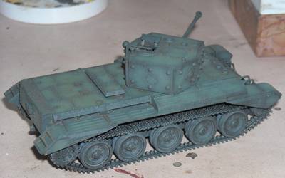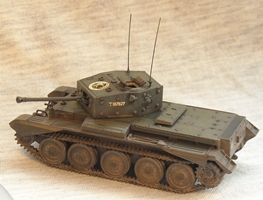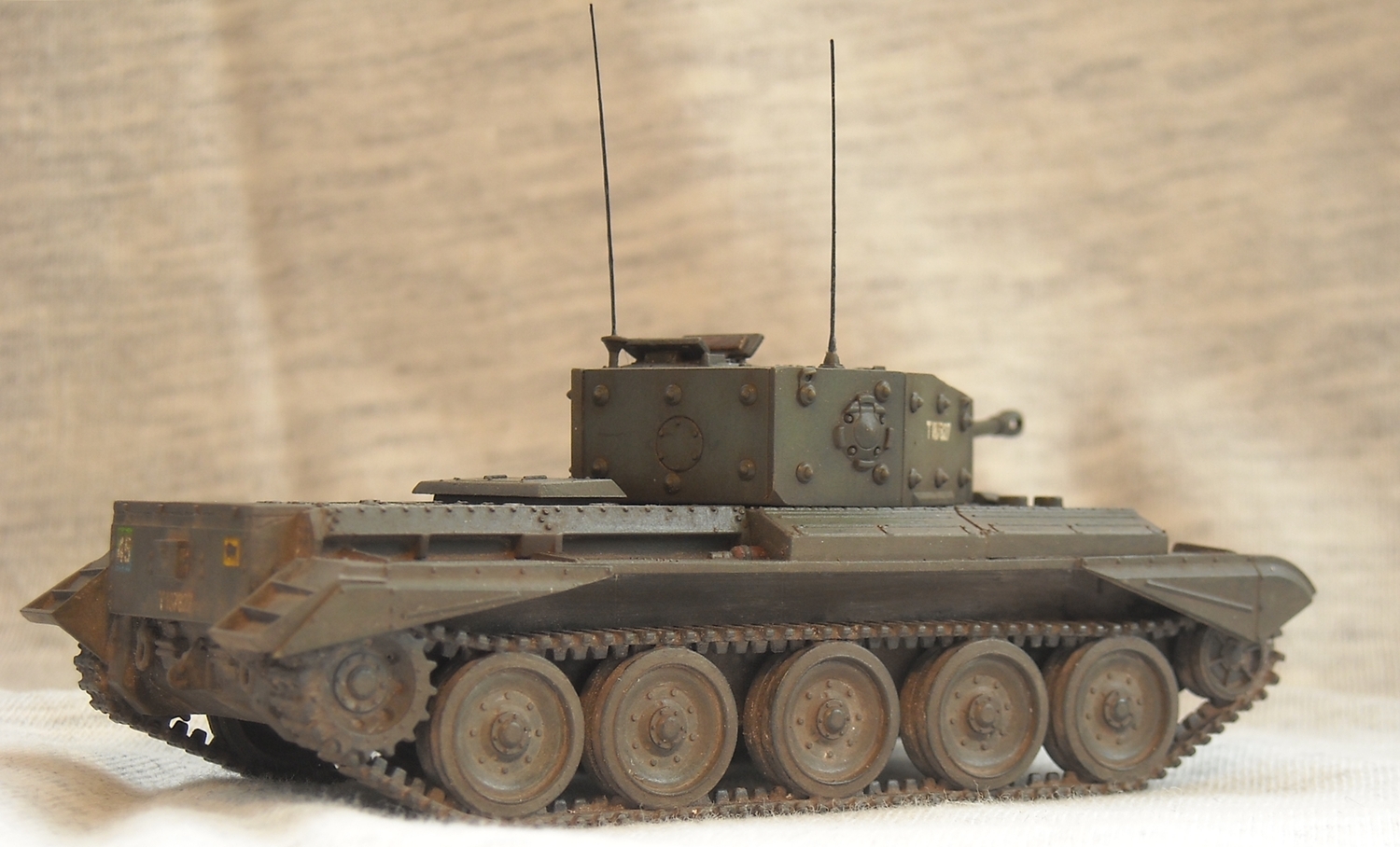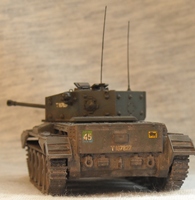 it ? Or would it ? In assembly steps 18 and 19 you can fit a hedgerow device and wading hood as an option. Apparently neither were ever used operationally, or so I have been told, so I left them off. (Not that I had much to chose, as my kit was second hand and the hedgerow device was no longer included.) Note that if you go for the hedgerow device you need to leave off the tow shackles in assembly step 7, but I feel that this is not really clearly indicated in the manual. Then again, how good am I at reading the manual ? Next come the tracks. They are very nicely cast, and click into eachother with amazing ease ! The only mistake I made was to cut out the individual links along a line on the inner side that I assumed would be where the sprue stopped... Mistake ! You have to cut about 0.5mm further outward, which I would have noticed had I looked either at the track face or the track sections. Live and learn, and write it down in a review. It's a pity some of the very nice track detail got ruined this way, although I did manage to restore them to full width. There are no spare links, but there is enough track to go around, although I feel that the top and bottom sections (parts (53) and (54) respectively) would better be switched, and some individual tracks fitted where the tracks "take a corner" at the first and last roadwheel. You can easily leave two links off the idler and drive sprocket. It would even be advisable, or you will have to bend the sections a little to ensure a good fit. Easy enough to do, though. On one side the track was half a link too long to have a perfect fit. As you have little margin for sagging on this tank, I decided to hollow out the axle of the drive sprocket a little so I could move it backwards just a tad. (Note that the mentioned drive sprocket in this tank is at the rear !) The turret can be fitted on top of the hull in a way it can rotate, which is a feature I always appreciate. There is a small amount of play however.