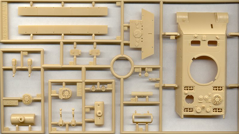 Same sprue from the other side. Notice the grooves along the edge of the overhangs of the lower hull. These need to be cut through for the Ausf. G in order to fit inside the upper hull.