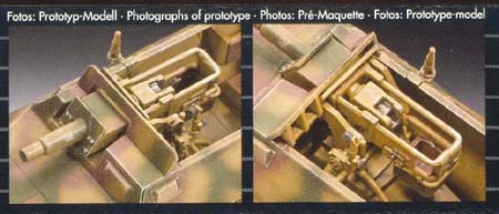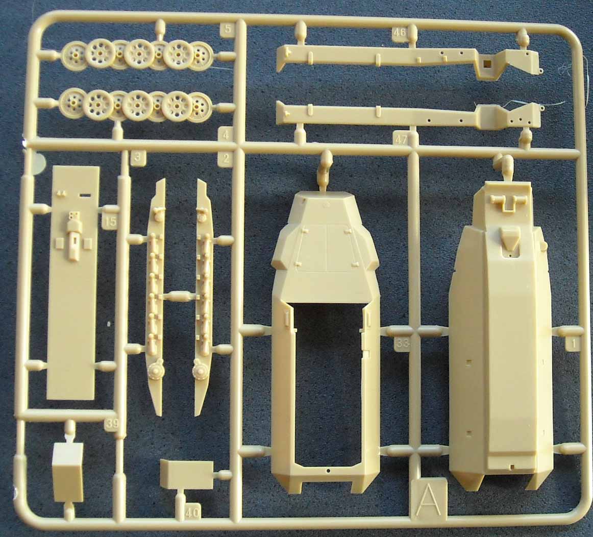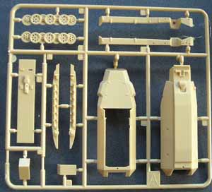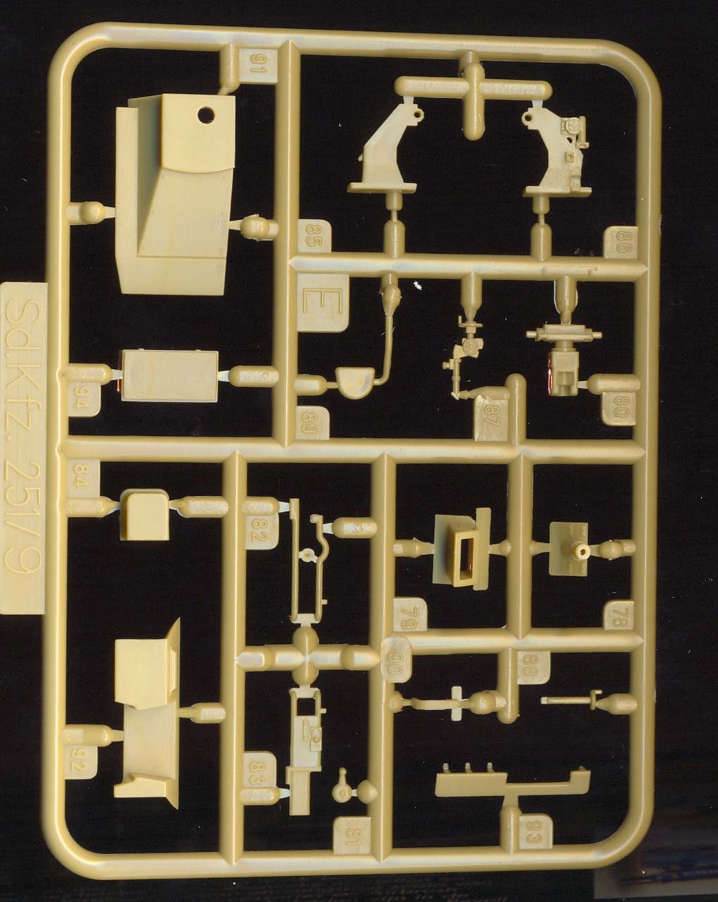 b) Sd.Kfz.251/9 In this kit the last sprue contains all that is needed to convert the vehicle into a /9: gun and mount, boxes that replace (part of) the benches, and a new roof plate. At first sight this assembly looks very nice. As you still get the original roof, you will still be able to build this kit as an ordinary /1 and use the remaining parts to convert an Ausf.D kit, so nothing is lost.