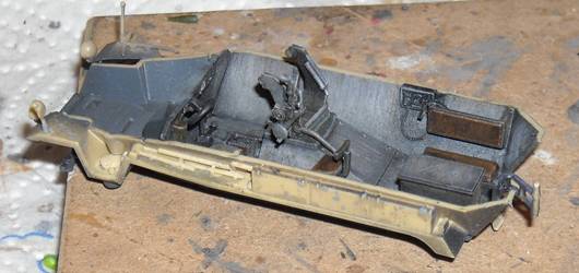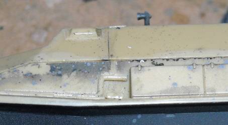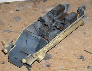 mounted on the fenders, instead of on the hull sides. When you come to step 25, it's best to obey the instructions and install part C50 (top of the muffler). I had hoped to able to leave it off until the end, end ended up regretting it. I had also hoped to be able to leave the gun assembly off until after painting, but the top of the gun shield makes it almost impossible. I also found the rear Notek light to be a bit poor, and while I have resin parts in my spares box to replace it, I wanted to build this kit as much out of the box as possible.