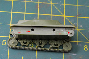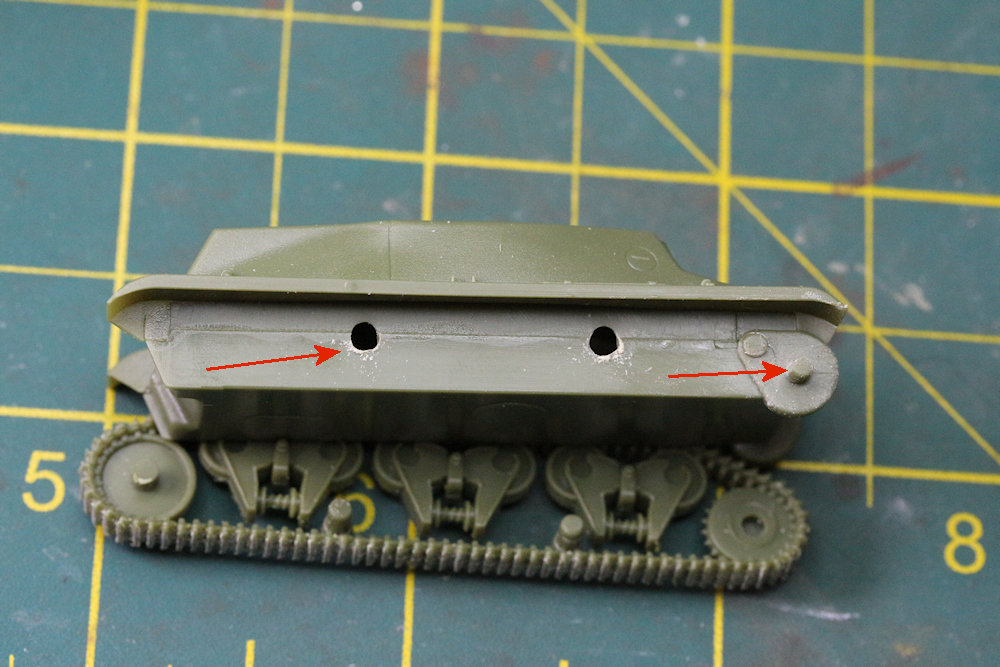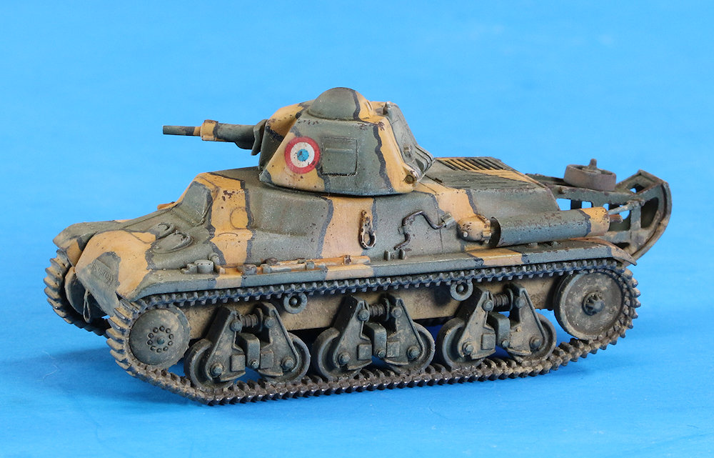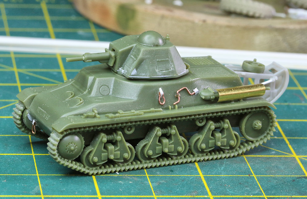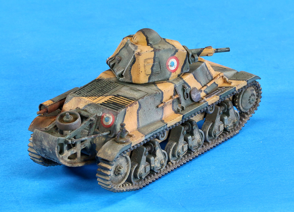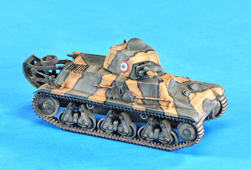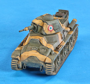 starting point. By the way, scans of the kit parts and instruction sheet can be found in Rob's earlier review of the pre-production version of this kit. Personally, I like his better... The following two scans show the simple modifications that I made for this kit. The rods that attach the rear trench-crossing skid were too long, so I fabricated new ones from styrene rod. The engine crank handle and the towing shackles were all represented in etched brass, which looked absolutely terrible, so I replaced those with copper wire bent to shape and styrene. There was a small amount of putty work on the turret, and the front and rear joins between the upper and lower hull parts. Had I wanted to go further, I would have improved (or even replaced) the molded-on pioneer tools, and replaced the tool brackets for the shovel and pick, which are molded onto the plastic parts. And of course, if one has replacement wheels and tracks, those would drastically improve the looks of the final model. Assembly of the model was easy, as it is for pretty much every S-Model kit I have built to date. The only tricky bit I encountered with this one was that the wheel/track units seemed to sit up too high on my kit, so that the tracks were scraping the underside of the fenders. The following picture illustrates where I did some targeted grinding in order to make the track units sit a little bit lower on the hull sides. I don't think I took it far enough though. I now think, perhaps, that it may have looked a little better had I tried to carve out the undersides of the fenders so that there was room underneath them to accomodate the tracks. That would have likely looked a little better, but it certainly would have been more difficult. I tried a new technique with the painting this time. As I was looking for something a little more colorful than simply another green tank, I saw this pattern in (I think) and old Concord book on the invasion of France, and thought it looked intriguing. But how to paint the fine black lines? I don't trust my ability to use a simple paint brush; I figured that my hand would likely shake, and it would be difficult to keep a consistent thickness of the lines. So I bought some generic acrylic paint pens with a 0.7mm tip, which was the finest tip that I could find. I'm not happy with the result. First, I think I needed a 0.5mm tip, but I don't think they make them that fine. And secondly, my hand still shook resulting in some pretty jagged lines in places. I ended up having to do a lot of touch up with the paint brush anyway, which looked far better than the pen, so I think the next time I attempt one of these demarcated schemes, I'll just try to free hand it. Maybe I need to try one of those hand stabilizers... I airbrushed the green base coat, then hand painted the yellow camouflage with Vallejo Model Colors, which did not cover very well. In order to get solid coverage so that I could see no green through it, I would have had to lay down an incredibly thick layer of paint. So I mostly just hand painted a wide outline of the yellow patches and then filled them in with the airbrush. Another example of a camo scheme that I should have masked. Ultimately, I think I hit my goal of making something that I'm happy enough with to put in my display case. I think I am always going to find fault with my own work, and this one is no exception. Maybe instead of looking for flaws I should highlight what I'm happy with; in this case, I think I'm getting pretty good at painting old mufflers. I'm also happy with the dirt on the trench-crossing skid. I keep treading the line between a tank that is simply dusty and one that's totally gunked up with dirt and mud, always ending up on something in between. Maybe soon I'll try to paint something really, really dirty. |