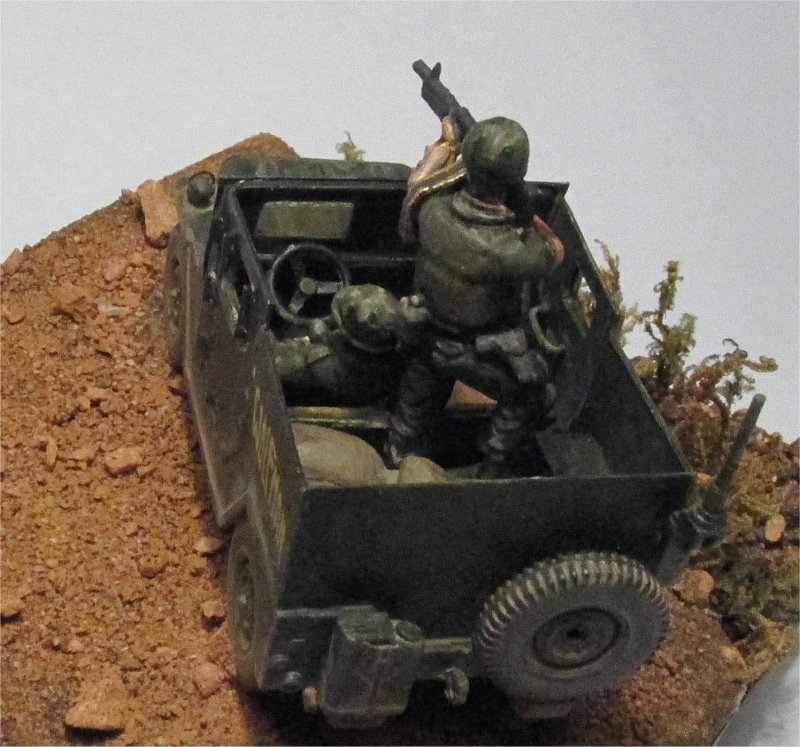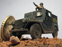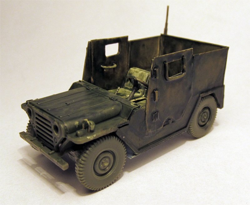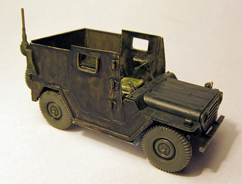 Historic background The Ford MUTT M151s used in Vietnam for convoy escort and reconnaissance were ideal targets, quite apart from their fragility against mines. Thus, crews started very early to add protection in the form of extra steel plates, which eventually lead to the distribution of two "official" kits from the US Army, consisting of steel plates covering the whole compartment, with one door per side; rectangular holes in each door had metal frames designed to hold bulletproof glass or simply steel plates with slits. There was a movable plate with rectangular holes covering the windshield and an additional plate covering the underside as a sort of protection against mines. Armored MUTTs in Vietnam were mostly M151A1. They were armed with single or twin M60s. There were a few that had the old .30 Cal MG on them. Building and converting the M151A1 The S-Model MUTT M151A1 contains 38 parts only, so it is not difficult to build. Doing the heavy scratchbuilding required to mend the structural errors of the kit (wrong undercarriage, anterior steering system, rear suspensions, steering wheel, thread pattern on tyres) was far beyond the amount of time I could dedicate to this project. However, I decided to scratchbuilt the transmission shift lever, the 4-wheel drive lever and the parking brake lever, without using the flat PE ones. The headlights were also drilled and the holes filled with PV glue, to give some impression of lenses.