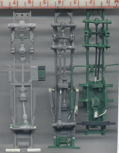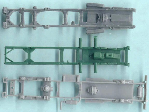 Above is a side by side comparison of the gray Coorperativa truck frame at top, the green PST frame in the center, and the light gray Hasegawa frame at the bottom. Looking at them you would not know there were for the same truck! The Cooperativa frame is representative of the rest of the Cooperative Studebaker kit: soft detail, inaccurate detail and lots of flash. This is a mightily challenging kit to build into a good display model. The green PST frame is a considerable improvement though we note a few sink holes in the bottom of the engine area. The Hasegawa frame at the bottom has sharp molding though is very simplified compared to the other kits: note the molded-in leaf springs. The Hasegawa kit is considerably longer and wider than the Cooperative, PST and Airfix truck frames.