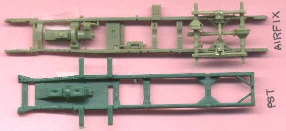 Above is a comparison of the (partially assembled) light green Airfix GMC frame above the dark green PST truck frame. Despite that the winch assembly is not yet installed on the PST frame it is still evident that the Airfix frame is a little longer and wider. The Airfix frame has my vote for the most accurate and detailed of the four manufacturers.