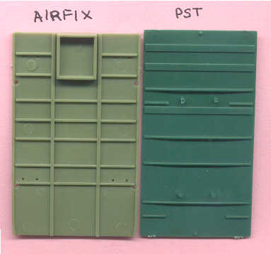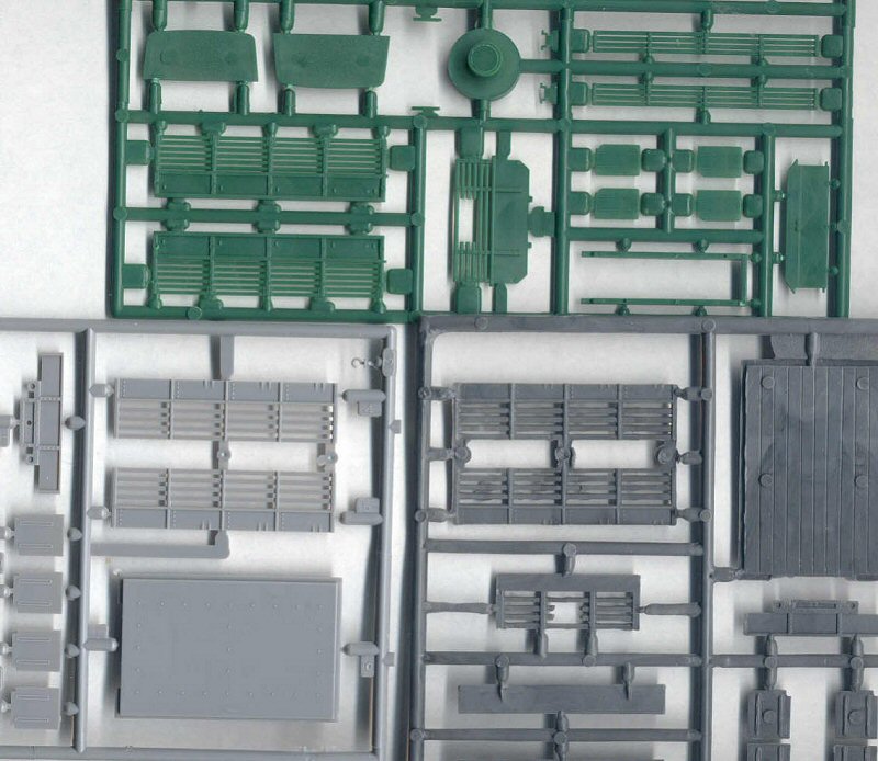 Despite all these deuce & half truck models being advertised as 1/72 scale, every one of the four has different dimensions! This is evident in the Airfix and PST cargo beds. PST had annoying sink holes in their truck bed. In the above scan of sprues from the PST, Hasegawa & Cooperativa you may be able to see that PST and Hasegawa offer the sharpest molding. PST and Airfix also give us a wood bed. Cooperativa gives us a wood cargo bed (with big positive ejection pin marks). Hasegawa features a steel cargo bed.