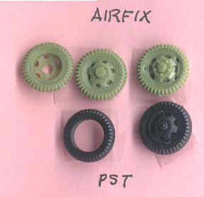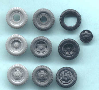 The light gray Hasegawa truck wheels at far left are slightly smaller than the other manufacturers despite the overall kit being larger. Hasegawas front wheels suffer the same mistake as Airfixs: only five holes in the rim rather than the correct six holes. In over fifty photos I have never seen a five-holed rim. This is truly an odd thing for Airfix and Hasegawa to do. If someone can exhibit a photo of a GMC wheel with five holes, please do. Hasegawas rear wheels have no vent holes at all. Cooperativas wheels are correct but molding is mediocre. PST appears to have the most accurate front wheels of the four kit manufacturers and has separate tires from the rims. Airfix appears to have the best rear wheels and both Airfix and PST have the best spare tires. All these wheels suffer the same common problem with injection molded styrene tires, that of poor tire tread pattern. Accurate cast resin tires, such as those offered by Milicast, would be most welcome. Airfix also has nasty sinkholes in their front wheels that will be very difficult to fix (thank god for mud & snow?).