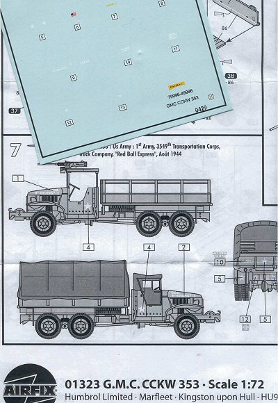 Airfix offers good kit instructions and multiple line drawings. Above are nice drawings showing the placement of the water slide decals. Airfix offers markings for only one truck but there are a lot of markings, a vehicle in the famous Red Ball Express during the summer and autumn of 1944 in France. I am unfamiliar with the decals offered in the Heller release of this model. Airfix and Academy are the only kits at this time offering the AA machine gun mount. Contrary to the Airfix box photo, no 5-gal. Fuel cans are included in the box (These are available from LEVA and in Academys GMC and Jeep-Kubelwagen kits though). A pleasant surprise is that Milicast Co. of England offers a plethora of typically beautifully cast resin & etched brass conversion sets for the 1/72 Airfix/Heller GMC. These conversions include several short-wheelbase GMC 352s in hard or soft cabs, Studebaker variants in hard & soft cabs, fuel tanker conversions and radio vans, etc. with corrected front wheels. @ http://www.milicast.com/accessories/accessories.shtml