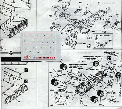 The PST kits are a considerable improvement over the Hasegawa and Cooperativa models. The kits share three common sprues for the chassis, bed and wheels & suspension. In the GMC kit we get a GMC cab, in the US-6 kit we get the Studebaker cab. Common to both PST kits are the engine hoods (bonnets), front fenders and fuel tanks for both the Studebaker and the GMC trucks. All the PST cargo kits come with decently molded canvas covers (tilts) for the cargo bed. No clear windshield or windows were in my kits, though a recently purchased PST truck kit included a new sprue of clear windshields and windows for both trucks. The PST M-7 and M-16A kits have a sprue for a fully enclosed box body instead of the cargo bed. The box body is well detailed and offers choice of open or closed doors (no interior detail is included). PSTs BZ-35S kit has the fuel tank bed from PST Zis-6 fuel tanker that the Soviets modified and used on the Studebaker US-6 chassis. PST offers a separate engine hood that is easy to model open and show off the engine. The same engine is included in both GMC and US-6 truck kits even though my references show that GMC and Studebaker used different engines. PST also gives us the option of making the 6x4 or 6x6 versions, and with or without the front winch. All the other kits require some major surgery and scratchbuilding to get a different variant. PST has a knack for getting many variants out of their kits, seven out of the GMC/Studebaker kit. [A few more sprues can give us the 1.5-ton Chevrolet 4x2 and the International Harvester 6x6 deuce & half trucks. This would be nice!]