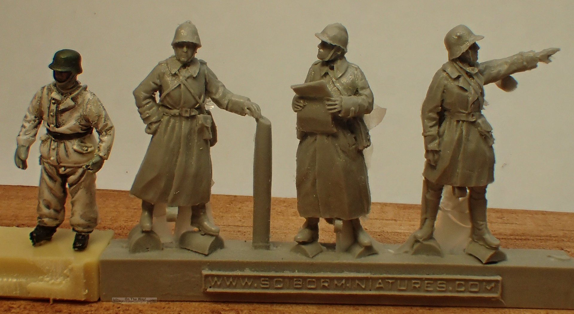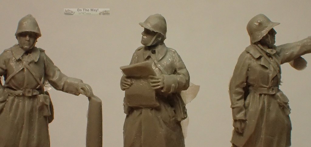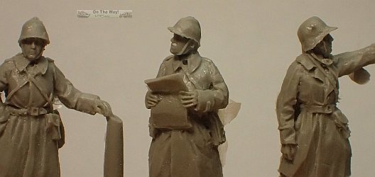 Figure 2 also wears an overcoat, and has the Adrian helmet. He hold a very finely cast map or other document in his hands.