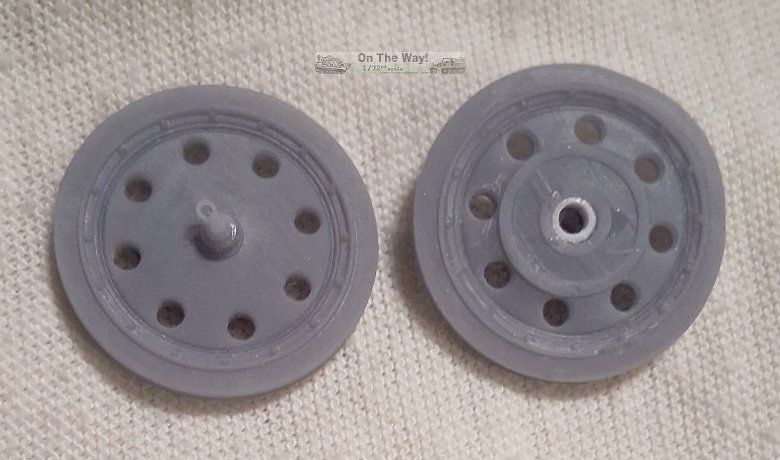 Because the replacement wheels differed with how they attached, sections of styrene tubing were glued into the wheel hubs to fit the axle stubs.