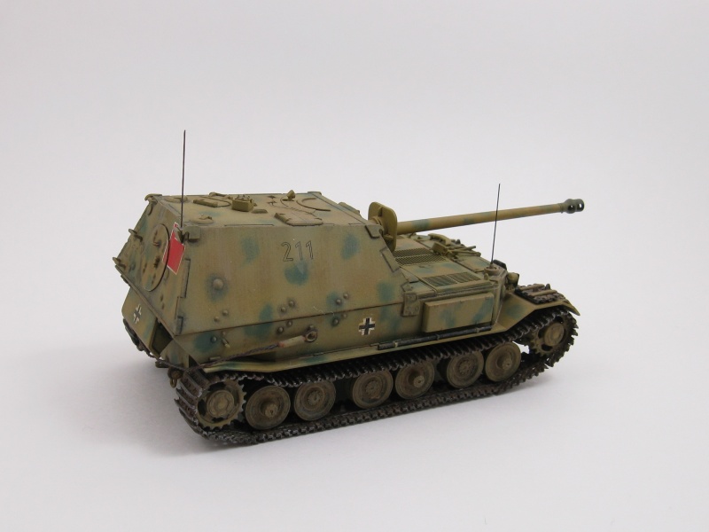 The kit comes spread over 6 sprues, one photo-etched fret and a separate hull and casemate pieces, totaling 254 plastic parts and 9 photo-etched parts overall. The decal sheet offers only one marking option which isn't identified. From what I can gather the markings are for Ferdinand number 211 of the Schwere Panzerjäger Abteilung 653, circa the Kursk battle in 1943. The decal option doesn't match the artwork on the box top. I figure the best way to describe the construction is to present my observations and changes in relation to the steps in the instruction sheet. Step 3: Step 4 (which is shown as a duplicate Step 2 on the instructions): The tracks were built in three runs to lessen the work when the painting the tracks and to make installation following painting easier. Though this did make painting much simpler I discovered that adding the parts afterward made alignment somewhat difficult and I wound up with a vehicle that has a bit of a 'knocked knee' look to the tracks when viewed directly from the front or rear. I think the problem arose with the mounting of the run that I had built around the drive sprockets and idlers. When I added my super glue to the axles and pushed the idlers and sprockets onto the axles they wound up too close to the hull in relation to the bogies resulting in a minute jog in the tracks. The road wheels fit poorly to the axle stubs. Most of the holes on the reverse side of the wheels are too big for the axles, so some care is needed to ensure they are glued on straight. Step 5 (which is shown as a duplicate step 3 on the instructions): Step 7: Step 8: Step 10: Step 11 & 16: Step 16: Step 17: Thread is provided for the tow cable but I found it to be too wispy to use and replaced it with some strands of thin wire twisted together. The cable is not even shown in the parts diagram on the instruction sheet nor is there any instructions as to how and where to place it on the model. I made some covers for the cable ends from some plastic rod, drilled holes in each end, and glued the cable and hooks into the holes. I wanted to route the cable as seen in most Ferdinand photographs but I inadvertently made my cable a tad too short so I improvised and routed it from side to side around the rear of the vehicle. I drilled holes for the antenna mounts and use some guitar wire for the aerials. The instructions say to use heat stretched sprue but I like the look of guitar wire better. The instructions also provide no information on how long the antennae should be so I guessed the length from photos found on the world wide web. The carpet void claimed a few pieces on this kit, which was unusual for me. I lost the door handle (part C32) so I made a replacement from some thin copper wire. I also lost one of the headlight covers (part D5) which forced me to replace them both with a pair found in the spares box. To make painting easier I left the door off and used the hole to insert a handle. Decals were excellent. They snuggled down tight after some dosing with Microsol solvent. All in all this is a nice kit, but the building proved that the great looking moldings in the box had a few issues with fit that make this kit more of a challenge than it first appears to be. Review sample purchased by the author. |
