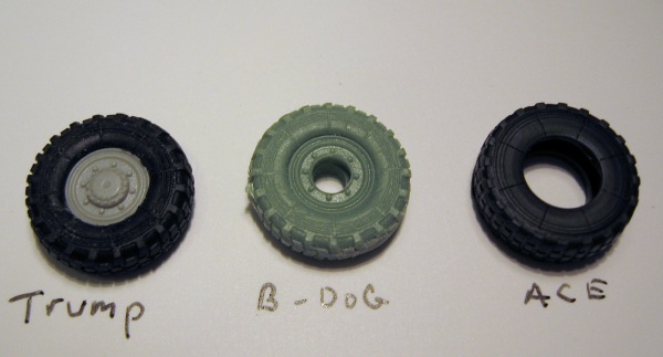 | I compared 3 kit wheels from different companies (Trumpeter, Black Dog and Ace). They are all nearly alike in height and width, with the exception of the ACE kit wheels,