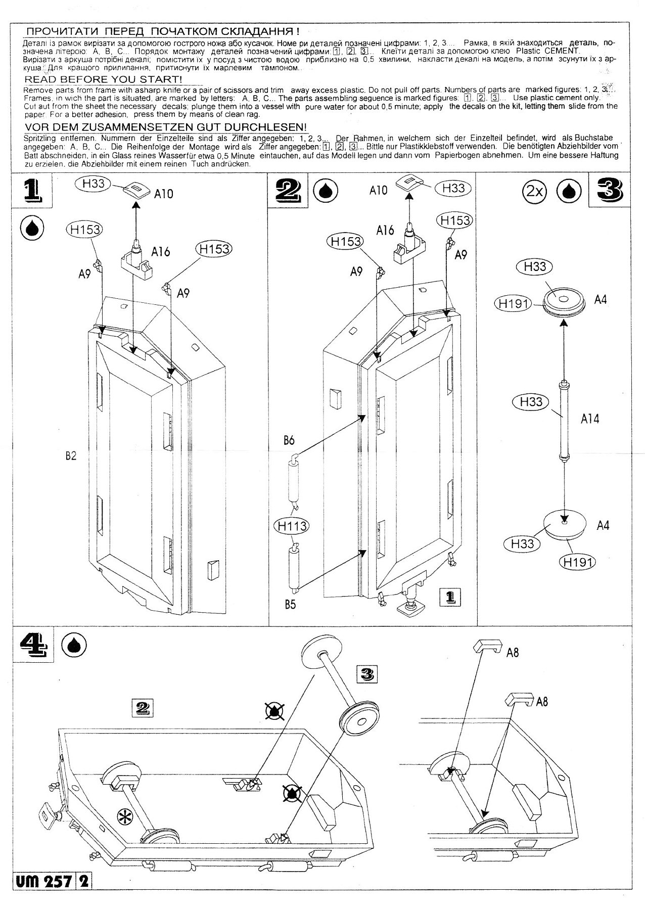 Parts are molded in UM's typical soft, light grey plastic. Flash is minimal and for the most part the molding is well done. There a few spots to look out for where the plastic has some low spots and requires some filling: at both ends of the upper body (part B1) and on the square hatch molded on the hull top (where part B7 attaches to in Step 6). A nice touch is the molding of the upper and lower hulls as one piece units. This removes any chance of alignment problems that you usually get with multi-panel assemblies. For this review, I'll use the instruction sheet as a guide and alter the suggested build sequence to make the construction more sensible. Step 3: Step 9: With some experimentation I found the best approach to the problem was to first glue the wheels to the axles (this is why I suggest the build should start with Step 3) so they can be used as a spacer between the rails to ensure the proper distance between them as they dry. To attach the upper part of the rails to the lower half on the ties, first glue the end points, then glue the remainder of the length between the ends. I strongly suggest using a fast acting liquid glue for this, such as Tenax 7 or methylene chloride (MEK). And be very careful, because until all the parts are attached and set, the rail is quite flimsy and easy to bend or break. After everything has dried, then you trim and sand off the sprue attachment points, and while you're at it add some grain to the featureless wood ties by scraping them with the tip of a hobby knife. There are a couple of oddly placed reliefs on the tracks that siamese with the rails. These should be removed. Step 4: Steps 5, 6, 7 & 8: Parts are provided to build one of two versions, differentiated by the engine covers and gun ports. The early version uses part B3 for the engine cover and parts B12 for the gun ports. The late version uses part B10 for the engine cover and parts A7 for the gun ports. I chose to do the late version primarily because the gun ports were molded better. The early gun ports were marred by prominent sink holes that would be next to impossible to fix without totally destroying the detail. The front and rear gun ports (parts A7) have a small bump on their backside that is intended to slot into a small recess in the hull, but the recess is not present. I had to trim the bumps and sand the bottom of the ports flat in order to mount them to the hull. Doors come as separate pieces (part A2) as opposed to molded directly to the hull as found on the other German draisines offered by UM. Why this was done I have no idea. All the separate door parts accomplished was add more work to the build. They didn't fit flush so sanding was needed to thin them enough to remove a step that would have resulted if they were added as supplied. All of the view ports are problematic. The set that is located beside the gun ports on the lower hull are just a smidge too short lengthwise. The small indent in the hull where they mount is slightly larger than the covers so you have to decide at which end of the cover you want to add your filler. I chose the bottom side because it is straight and I could sand the filler without worrying about removing the molded on hinges. The small ports (part A17) that mount to the sides of the casemates on the top hull are either too large or the casemates are a bit too short. Either way they pretty much span the space between the hatch cover and the top of the hull which isn't what I see in my photo references. Hull vision slots are marked as part A4 in Steps 6 & 7 but they are actually part A1. A4 is the part number for the wheels. At this point I also added some missing detail. The kit has no front and rear headlight covers plus their hinges, so some round covers were punched from a sheet of plastic and hinges were excised from a kit found in the spare parts box. I added most of the missing rivets to the lower apron that runs around the perimeter of the lower hull. The exhaust pipe ends were drilled out. The two gun ports on the left and right side of the hull were opened up and new covers were made to accept a pair of MGs I planned to add later for some visual interest. Foot rungs fashioned from thin wire and added to the lower hull. After all this, the two hull halves were joined. Step 10: Steps 1 & 2: Painting: References: Review sample purchased by the author. |