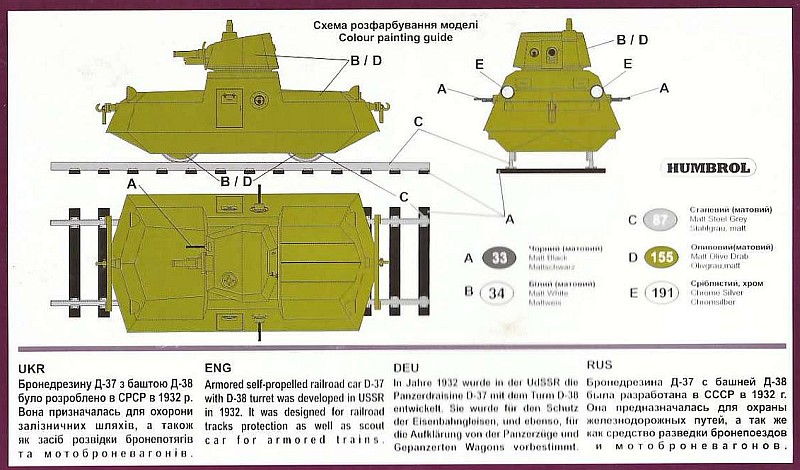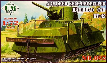 This is the second offering of over a dozen armored railroad car kits by this manufacture in their Rail Wars series of kits. According to the summary on the rear panel of the kit box this armored self-propelled railroad car, DT-45, is an upgraded and modernized version of its predecessor railroad car D-37. Developed by the Russians in 1933 to supersede the D-37 it was designed for use as a scout car running ahead of armored trains and for railroad tracks protection. The cylindrical T-26 turret with the 45mm gun and 71TK radio set with mast rod antenna was fitted to the unchanged D-37 hull. Along with special engineered equipment to allow easy transfer of the armored railroad car onto parallel rail tracks. Manned by a combination of both crew and troop members numbering seven, this armored railroad car was successfully tested but never went into series production due to, at the time, limited manufacturing capabilities. An unspecified number of prototypes were used for training up to the opening days of WWII. I was unable to find any specific information or photos on the Internet of this armored railroad car.