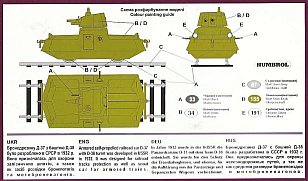 The instructions are the typical UM three dimensional line drawings broken into 13 steps with a history summary written in four languages, including English, presented on the first page of the four page instruction sheet, with the marking and painting guide included both on the 4th page and rear of the kit box. A generic decal sheet is included for use on both the hull and turret. Assembly steps 1- 9 will guide you through building up the rail wheels, hull and placement of the associated photo-etch parts. Step 10 is for the turret and step 11 is for the radio mast assembly with a single dimension detailed drawing to aid you in bending of the wire antenna mast and placement of the photo-etch masts on the wire antenna mast. Step 12 aids you in placement of the turret and radio antenna mast onto the railroad car hull. Step 13 gives you an overall view of the finished model with it placed on the tracks. The instruction sheets are available for viewing over on the Henk Of Holland website in the UM-Technics web page. Scroll down to find kit #602.