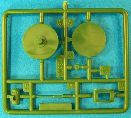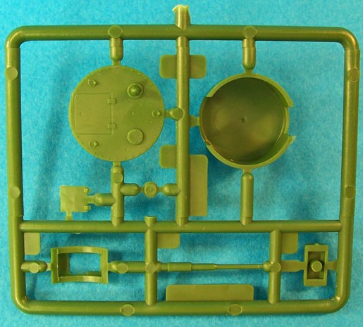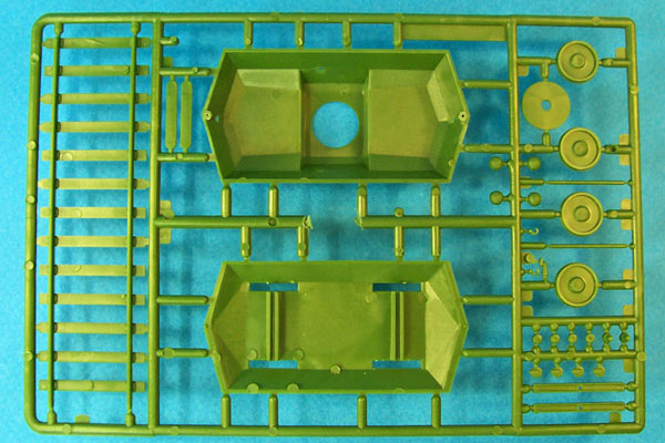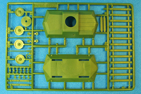 My kit's plastic parts came molded in a medium to light green color. The overall quality of the plastic molding is very good with almost no mold flash or misaligned parts. I didn't find any sink holes or ejector pin marks on any of the appearance side of the plastic parts. All of the plastic parts came warp free. The horn, three submachine guns and the 45mm gun barrels will have to be drilled out for added realism. The plastic railroad wheel axles look to be a bit on the weak side and it would be advisable to replace them with heavier plastic rod or brass tubes of equal or close to same diameter parts. Check the UM Technics #604 kit review article by Al Magnus for his work around solution on this problem.