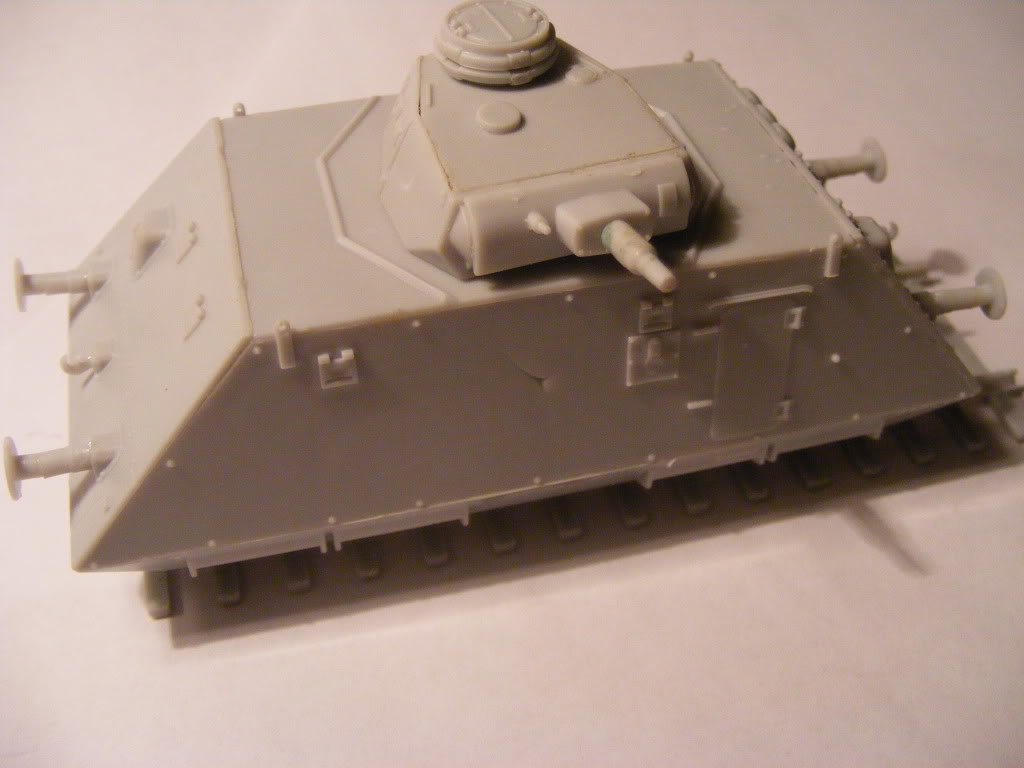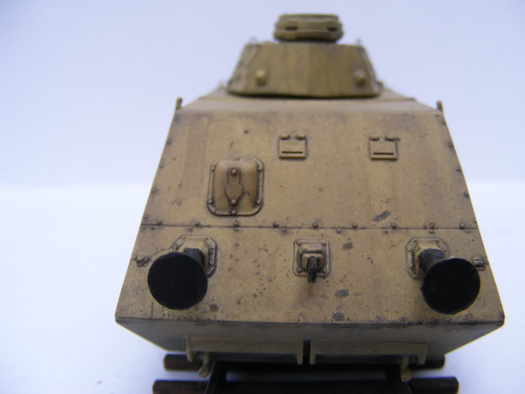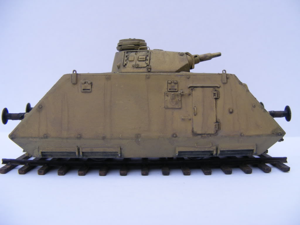 The 'Sp' is short for 'Spähwagen' (scout car) and the 'S' is an abbreviation for schwere (heavy). These cars were self propelled with an air cooled 76 h.p. Steyr motor. These cars were in combat operations from late 1944 in the Balkans and could be configured as full or half trains (Armoured Heavy Scout Trains, numbers 201-210) with a mixture of artillery, infantry and command cars, as well as with tank carrying cars, pushers & 20mm quad flak cars. Being late war, there are not a lot of photos of these, and all are black and white, and seem to indicate they were painted overall in German yellow, similar to how many panzers were painted. This makes for a simple paint job, but it's how they were. They also seemed to have no markings. Some that survived the war may have had markings added afterwards. The kit was pretty straightforward and I built it pretty much straight out of the box. Overall construction was simple with few problems. No warped pieces and no flash, except on some turret pieces. The slab sides, ends, chassis and top of the hull are all a very good fit, with no extra sanding or modification needed. There are a few very minor hairline cracks on one or two joins, which are barely noticeable, and were very easy to fill. One side of the body there is a small fissure that almost looks like battle damage - appears the plastic didn't quite cover this area & will be very easy to fill - you can see it in one of the pictures below. The buffer beam supports were not a good fit into the body. I cut the locating pins off the ends to ensure a flush even fit onto the mountings. The round buffer faces have very small sink marks - these were easy to fill. The gun barrel will need drilling out. Wire rungs were added to the body sides and the turret roof, as the kit comes with moulded on lugs that don't look good. The Panzer III turret had a bit of flash, and the turret roof needed some sanding to make it fit. I couldn't find my old Revell Panzer III Ausf. N to compare against the UM version. What is supplied in the kit looks the part, though I'm sure a Revell turret would be better detailed. The pistol ports at the rear of the turret were not cast in a fully rounded shape, some sanding improved their shape a little. An ESCI Panzer III turret I had on hand fit nicely, but as it was from a Flammpanzer I didn't use it. Part B1 was missing from the kit. This is a tiny piece measuring perhaps 2mm x 1mm and locates on the lower hull between the exhausts. I'm not sure if I lost it, if I did it must have been loose in the bag. I doubt anyone other than a rivet counter would notice it's missing, but it will be an easy job to make another from a piece of plastic rod. The axle and wheel assemblies are a little sturdier than on the D-37 & DT-45 railcars, but I glued mine in place anyway, as this will be a static model. The rail track supplied with this kit is a couple of millimetres narrower than the track that comes with the D-37/DT-45 kits. As these were probably not operational on Russian broad gauge this is probably correct. Pictures exist of these cars in Germany and on duty in the Balkans. My in-progress picture shows the model built totally 'out of the box', with no modifications, or filling, or changes, yet. I've yet to add the pioneer tools & the gun cleaning rods, which will be added after painting. Wire rungs will be added on the body sides and the turret roof, as the kit comes with moulded on lugs that don't look good. The kit comes with a set of solid Balkan crosses without outlines (similar to those used on Panzers), in black and white. Wartime pictures of these are uncommon, those that can be found show no markings. There are photos of one taken post war with Balkan crosses the same as supplied with the kit, but it's possible these were added after the war. Going by some antenna masts included on the sprues and the fact that the Infantry and Command Heavy types share approximately 90% of the same parts as this kit, it appears that UM will be releasing the Infantry and Command versions of this car sometime in the future but so far there has been no sign of them. This may be due to some serious mould problems reported by other modellers. I'm hoping UM makes all the needed components to construct a 7 or 14 car train, as I'll definitely be buying all the components, based on this kit. It was not a difficult build. |