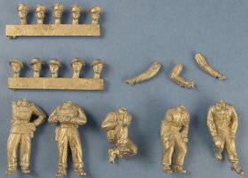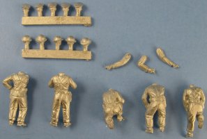 This figure set comes in a small plastic bag with a paper insert. Basic instructions are printed on the reverse of the paper and only consist of a warning to be careful cleaning up the castings to avoid damage and to de-grease the figures before priming. Also there is declaration that the parts have been cast in some sort of alloy metal with no lead content. A small colouring guide would have been nice for those, like myself, that have little or no references or knowledge of World War One uniforms anbd their colours. Paint manufacturer recomendations would also be helpful. Parts exhibit next to no flash and just a hint of a seam. Clean up effort should be minimal. You get 5 bodies in various poses. Arms and heads come separate. There are 3 arms, two of which appear to be identical. Heads come with helmets (5) or hats (5). For the helmets there are two with the chin strap across the brim of the helmet and the other three having the strap run under the chin. With 5 bodies and 10 head versions the modeller has quite a few options when mixing and matching the body parts. Scale is listed at 4mm to the foot, which works out to 1/76 scale. I measured the parts to see how tall a completed body would stand. Using my trusty dial calipers I measured the longest bodies, which came to 0.80in, and each of the heads, which were about equal at near 0.19in. When added together this comes out to 0.99in which is just a tad under 6ft tall in 1/72 scale. When one considers that the average height of a US soldier in World War Two was 5ft 8in (I found this on aweb site someplace), and I would suspect that World War One soldiers would be not too different, making these Brits toward the tall side for service men and should be more than acceptable for most applications. Preview sample provided by Barry Williams of W^D Models. |