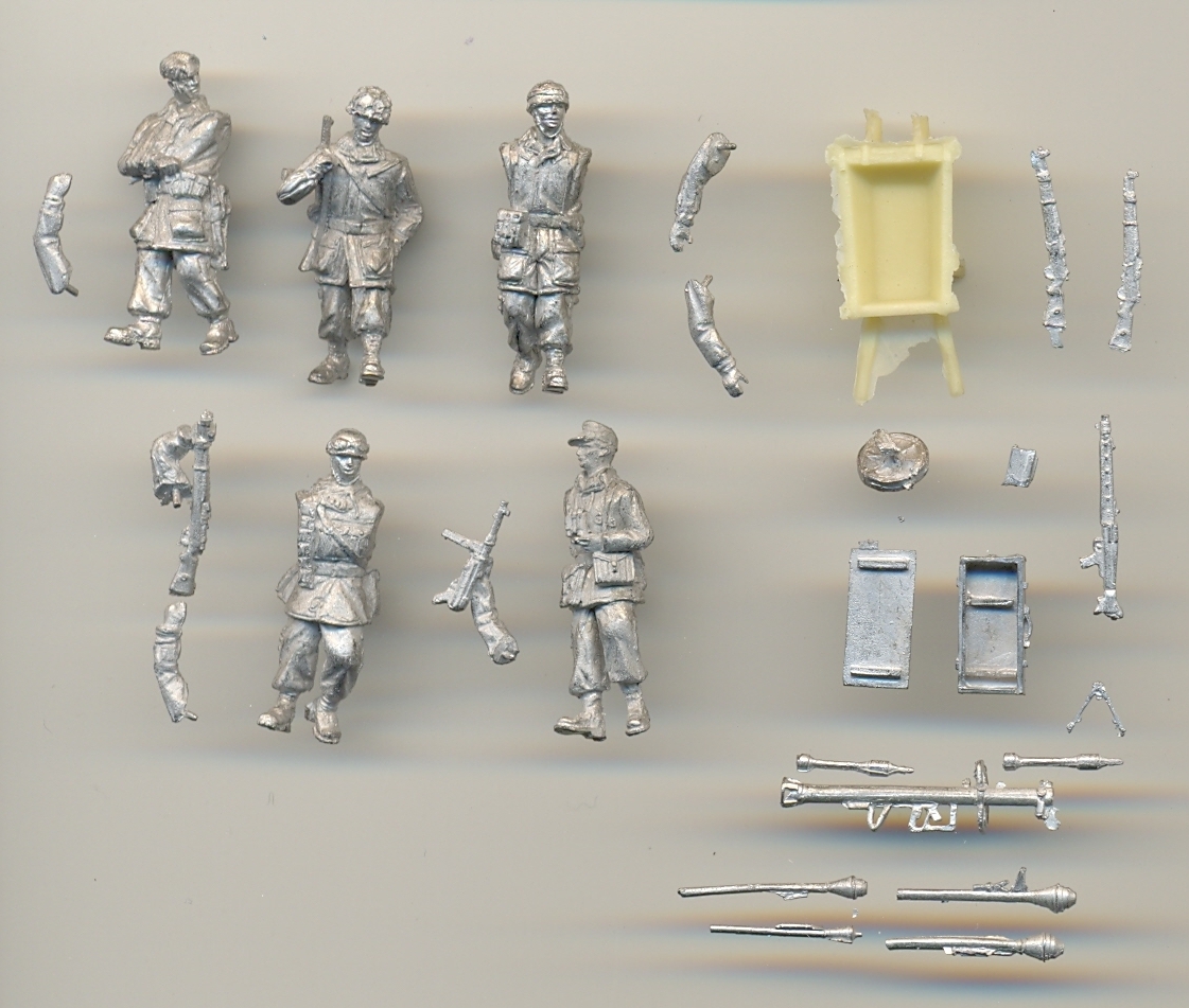 need a fair amount of cleanup. Doing the math, that would mean that this demi-squad is quite well armed. That said, I don't think all the spare weapons would ever fit in that tiny wheelbarrow. These five figures make for an almost instant vignette representing retreating troops. Add a burnt out AFV on the side of the road and you're done ! |