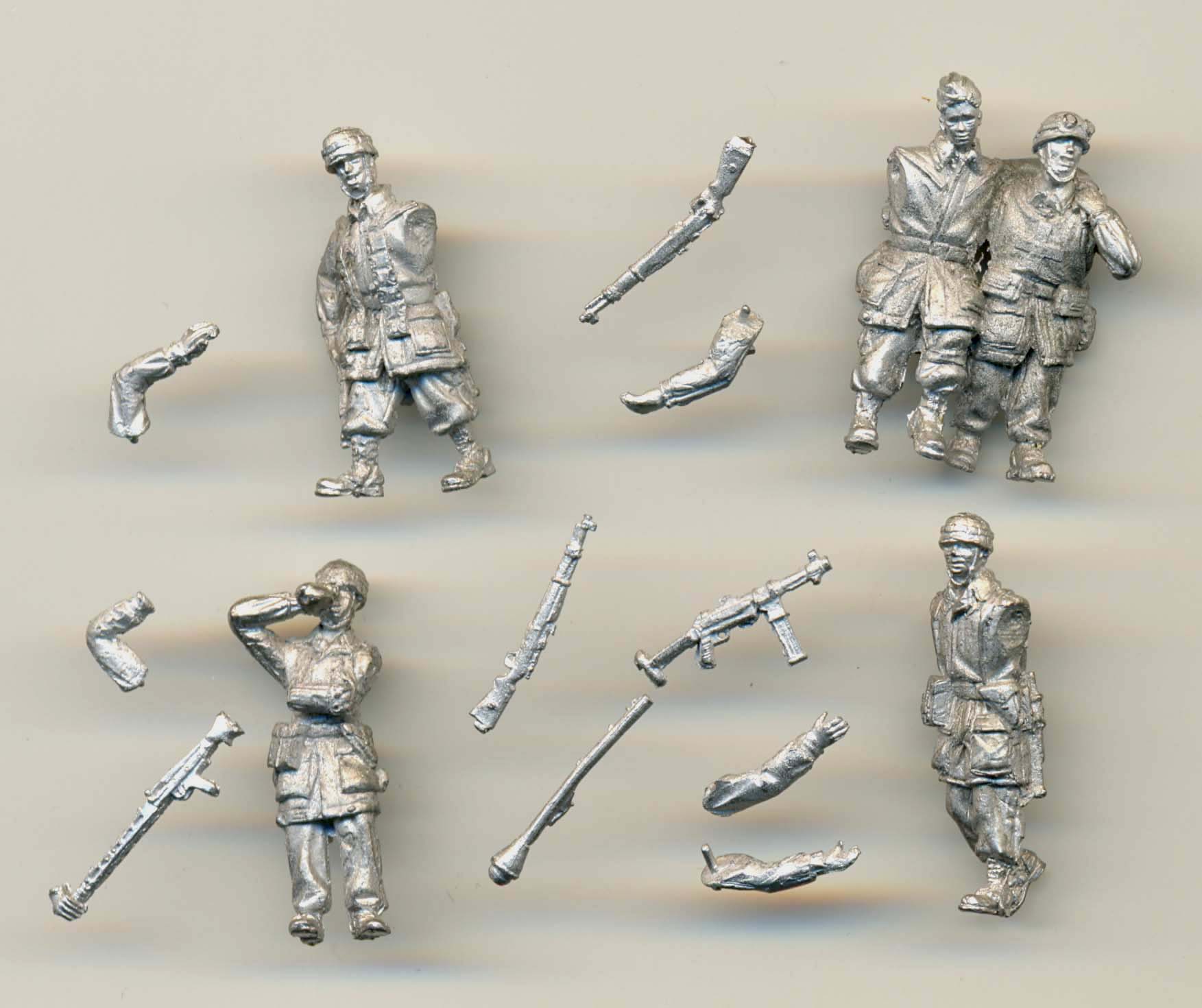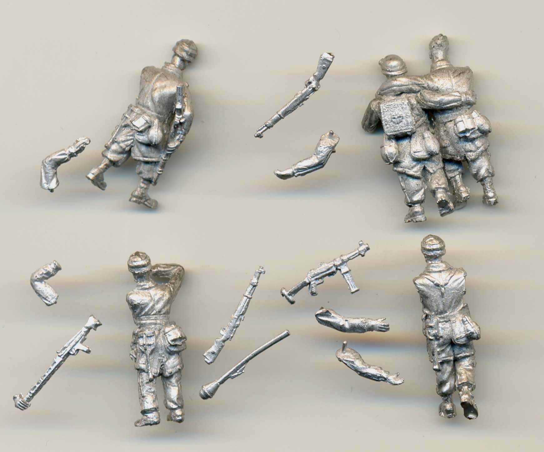 - a set of two figures comprising a medic (with a red cross on his shirt and medical pack on his back) and a wounded soldier. The latter has something that looks like a sling around his shoulder to which the MP40 might be attached, but that seems to be to too bulky to fit easily. (I mean, the MP is realistically done, but it's just to big to go there.) Neither does he have the typical MP40 pouches.