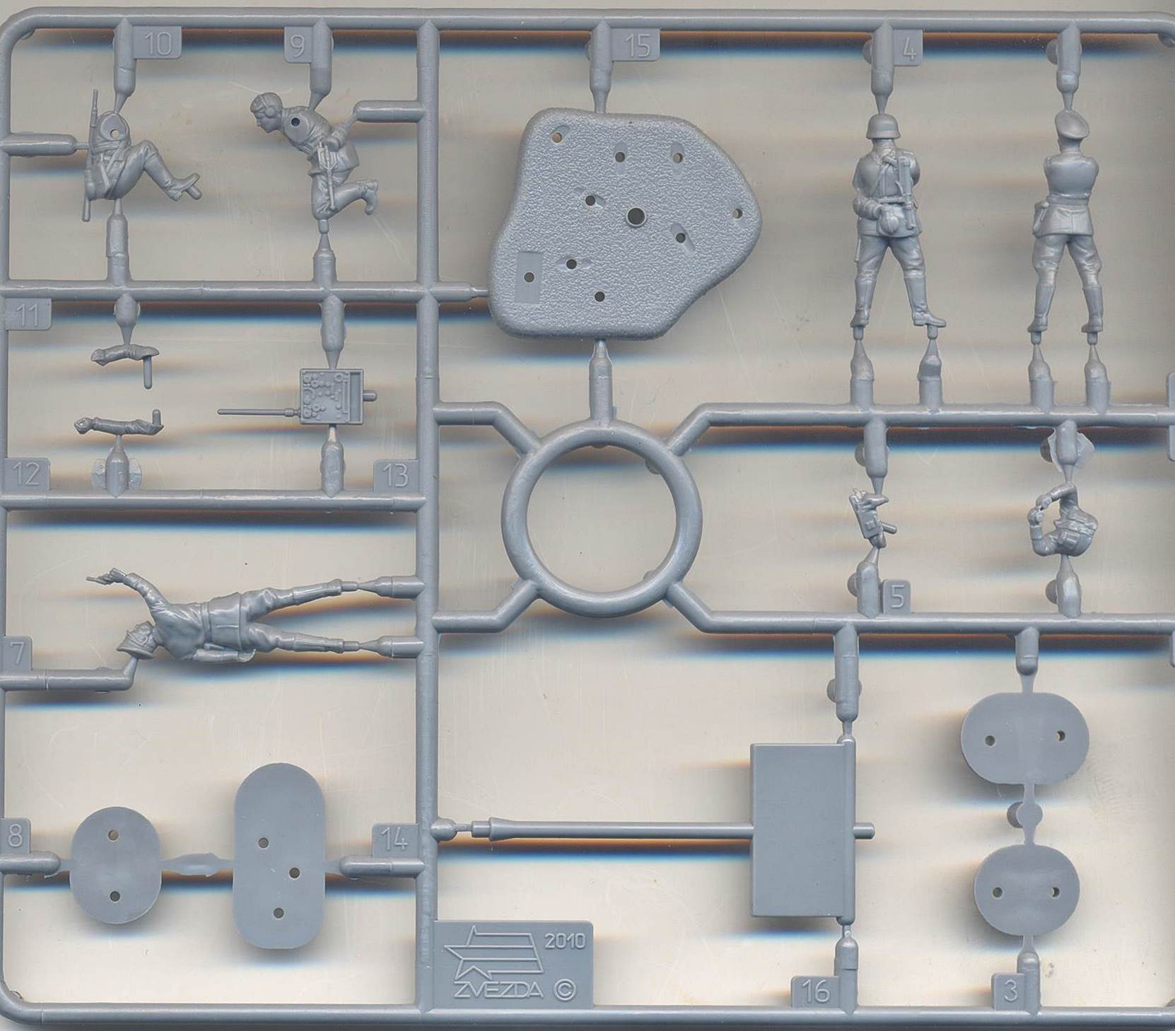 While primarily aimed at the wargaming community (witnessed by the base with oversized banner, the wargaming stats on the back of the box and on the playing card inside), this typical 4-figure Zvezda set is a very welcome addition to the figure collection of a static modeler, as they carry a high diorama potential. As usual, the front and back of the box leave little to the imagination. Inside the small end opening box is a single sprue of fairly hard grey plastic. This contains the parts to assemble four figures. A large part of this sprue is taken up by a banner and four base plates, which the display modeler will probably not use (except during painting). For those who are interested, the bases offer the option of grouping the four figures together or giving each figure its own base. The four