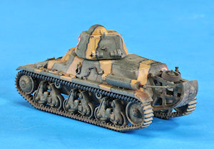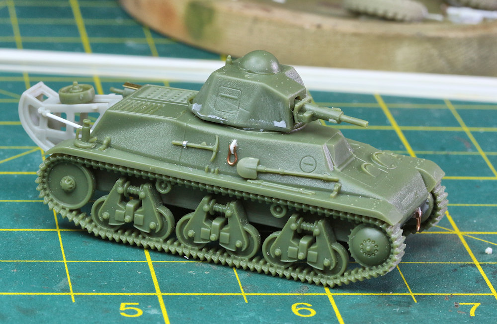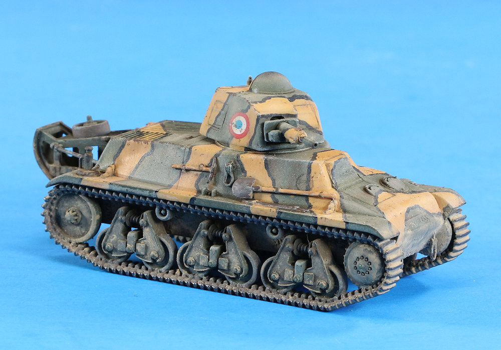 starting point. By the way, scans of the kit parts and instruction sheet can be found in Rob's earlier review of the pre-production version of this kit. Personally, I like his better... The following two scans show the simple modifications that I made for this kit. The rods that attach the rear trench-crossing skid were too long, so I fabricated new ones from styrene rod. The engine crank handle and the towing shackles were all represented in etched brass, which looked absolutely terrible, so I replaced those with copper wire bent to shape and styrene. There was a small amount of putty work on the turret, and the front and rear joins between the upper and lower hull parts. Had I wanted to go further, I would have improved (or even replaced) the molded-on pioneer tools, and replaced the tool brackets for the shovel and pick, which are molded onto the plastic parts. And of course, if one has replacement wheels and tracks, those would drastically improve the looks of the final model. Assembly of the model was easy, as it is for pretty much every S-Model kit I have built to date. The only tricky bit I encountered with this one was that the wheel/track units seemed to sit up too high on my kit, so that the tracks were scraping the underside of the fenders. The following picture illustrates where I did some targeted grinding in order to make the track units sit a little bit lower on the hull sides. I don't think I took it far enough though. I now think, perhaps, that it may have looked a little better had I tried to carve out the undersides of the fenders so that there was room underneath them to accomodate the tracks. That would have likely looked a little better, but it certainly would have been more difficult. I tried a new technique with the painting this time. As I was looking for something a little more colorful than simply another green tank, I saw this pattern in (I think) and old Concord book on the invasion of France, and thought it looked intriguing. But how to paint the fine black lines? I don't trust my ability to use a simple paint brush; I figured that my hand would likely shake, and it would be difficult to keep a consistent thickness of the lines. So I bought some generic acrylic paint pens with a 0.7mm tip, which was the finest tip that I could find. I'm not happy with the result. First, I think I needed a 0.5mm tip, but I don't think they make them that fine. And secondly, my hand still shook resulting in some pretty jagged lines in places. I ended up having to do a lot of touch up with the paint brush anyway, which looked far better than the pen, so I think the next time I attempt one of these demarcated schemes, I'll just try to free hand it. Maybe I need to try one of those hand stabilizers... I airbrushed the green base coat, then hand painted the yellow camouflage with Vallejo Model Colors, which did not cover very well. In order to get solid coverage so that I could see no green through it, I would have had to lay down an incredibly thick layer of paint. So I mostly just hand painted a wide outline of the yellow patches and then filled them in with the airbrush. Another example of a camo scheme that I should have masked. Ultimately, I think I hit my goal of making something that I'm happy enough with to put in my display case. I think I am always going to find fault with my own work, and this one is no exception. Maybe instead of looking for flaws I should highlight what I'm happy with; in this case, I think I'm getting pretty good at painting old mufflers. I'm also happy with the dirt on the trench-crossing skid. I keep treading the line between a tank that is simply dusty and one that's totally gunked up with dirt and mud, always ending up on something in between. Maybe soon I'll try to paint something really, really dirty. |