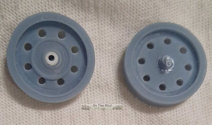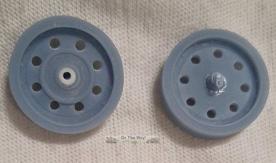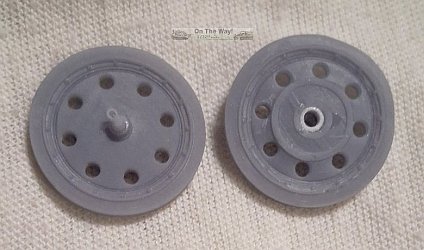 Because the replacement wheels differed with how they attached, sections of styrene tubing were glued into the wheel hubs to fit the axle stubs.