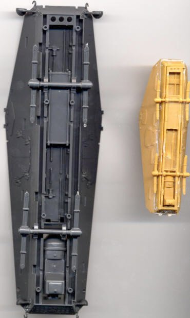 MARS The MarS kits differ a lot from ALBY's; they really deserve their name "kit" because they have over 100 parts which are perfectly detailed. I have to admit that this is the most astounding resin kit I have ever seen, not only considering the large amount of parts. The resin quality is also very different, while ALBY features a soft white, easy to cut resin with a rough surface, MarS resin is more hardened and a bit more difficult to handle. The hull has large extents where the resin was injected into the molds, it is impossible to cut them off with a knife, you need a saw to sever these extents. Again, be careful when you are sanding/sawing, I heard about a modeller who lost consciousness and was brought to hospital because he inhaled resin dust. This model is made of injected resin, (review Doug's Multimedia article), this is reflected by the fact that every part has these injection remains that need to be carefully removed. This is slowing down the construction phase and requires lots of attention. Detailing of the MarS kit is in some parts better then ALBY's, simply look at the barrels or the nicely-cast hatches with splashguards. The wheelcaps are not flat like ALBYs and the MarS kit has generally a much more three-dimensional look, that's where MarS scores but some shapes seem to be worked out too exaggerated. I think the underneath of MarS is the biggest strength, it is so nicely detailed that "crash" diorama showing a SdKfz lying on its side is almost a must. The Zerschellerplatten were added after the end of the France campaign in 1940, a nice add-on if you wish to build such a vehicle. Adding to that, MarS delivers more miscellaneous stuff like 2 fire distinguishers, 3 large boxes that were also commonly used and seperate pioneer tools. They also let you choose which kind of smoke dischargers you wish to have (if you swap with another MarS kit), you get one of these triangular boxes (which are used for stowage) and one four-tubed smoke discharger. ALBY's has them already molded on.