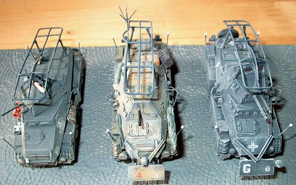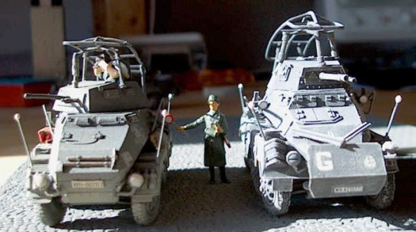 SDKFZ 263 I do not own the ALBY SdKfz 263 and im not even intending it to buy it. From the instructions I have it is about the same kind of kit like the SdKfz 232, just with another hull and the SdKfz 263 frame antenna plus the antenna mast. The MarS Funkwagen is likely the same kit too, just featering another body and antenna equipment. TAKE NOTE: This kit has no Zerschellerplatte as shown on the photographs of the built vehicle, its also missing the spare wheel, smoke dischargers and the jerry can. All other items are featured. SDKFZ 263 1:35 SCALE COMPARISON As you might have noticed, my SdKfz 263 is a DAK vehicle, it's sprayed in Panzergrau (Revell 78) and was oversprayed with Dunkelbraun (Humbrol 93). To be honest I was mostly inspired by Fabien Décamps "Funkwagen" article on the Missing Links site which deals about 1:35 solemnly. So I consequently lifted all his ideas and transferred them to my 1:72 kit, I hope he's not going to sue me :-). Unfortunately I was unable to make a direct copy of his fabulous kit (he plays in another league I guess) and to simply copy 1:1 would've been dull at all, so I modified it a little :-). Fabien used tactic marks for a Nachrichtenkompanie, which look really cool but I was unable to find some in 1:72 so I simply took a divisional mark and marks for a Panzerspähkompanie (ESCI) which makes the model a little more colourful. Talking about Swastikas: I'm no Nazi and it is really hard obtain the DAK Palm with a Swastika, (old ESCI Panzerjägerkit), I was hesitating to use these because I had never done this before and it is strictly forbidden to display these models in public. I hope your feelings are not being hurt by the use of historical correct DAK markings. I added the Zerschellerplatte from another MarS SdKfz 232. The sternantenne is also not supplied and was added by using wire. The paint seems to be worn off and scratched, I hope I did not exaggerate aging because this is the first feeling I have when looking at the model. I tried to spray less Dunkelbraun on edges just like Fabien did, after drying out I started scratching it off with scalpel and fingernails. I read a good article on Miniaturezone about Fe2O3 powder technique, my brother studies chemistry, so he passed me this stuff and I used it on the jerrycans (the only spot where rust can be in my opinion). SDKFZ 232 My built SdKfz 232 are both participants of the French campaign in 1940. I added the narrow white Balkenkreuze by TL-Decals (can be reached at www.TL-Decals.de). Tactic marks come from Matchbox Funkwagens and ESCI SdKfz 250. I drybrushed both with light grey and sealed the paint with clear matt varnish. I would not recommend using brushes to actually paint the vehicles as they are highly fragile and need to be handled with special care. I break off parts occasionally, thank god that there's superglue. I gave the wheels some angle so that the models don't look too flat and lifeless. Fixing wheels on the MarS can be real nasty and sometimes you need to cheat a bit to get a proper alignment. Basically I found the MarS kits harder to assemble (no wonder just look at the suspension) but more satisfying when I completed the work. DISADVANTAGES OF BOTH KITS The worst thing I found about these resin kits is that the hulls are one solid piece, they are nicely detailed but almost none of the hatches or vision flaps can be opened. Only ALBY's 232 features a hollow turret and seperated commanders hatch that can be displayed open. Now you have to think that visibility for the crew was always bad inside a SdKfz 232 especially for the driver, on most photographs you will notice that most of the vision flaps are open or at least the ones that surround the drivers seat. Now imagine you're not in central Europe but in the boiling sun of the northern Sahara, inside a giant of steel that seems to absorb all the heat, much worse than a car without air conditioning. You see what I'm aiming at: most photographs of African vehicles show them with all hatches and flaps wide open. This cannot be realised with both kits, neither engine or maintenance hatches, too.