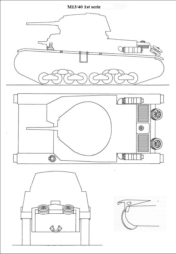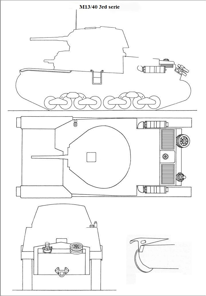 - (After 50th vehicle) return of long fenders, with reinforcement on the outer rim. Compared to long fenders of M13/40 1st serie, frontal edge was longer by 10 cm and had a longer curve radius. Since the 533rd vehicle, the small oval hole was hidden by a small romboid plate. No protection on lateral ladders.